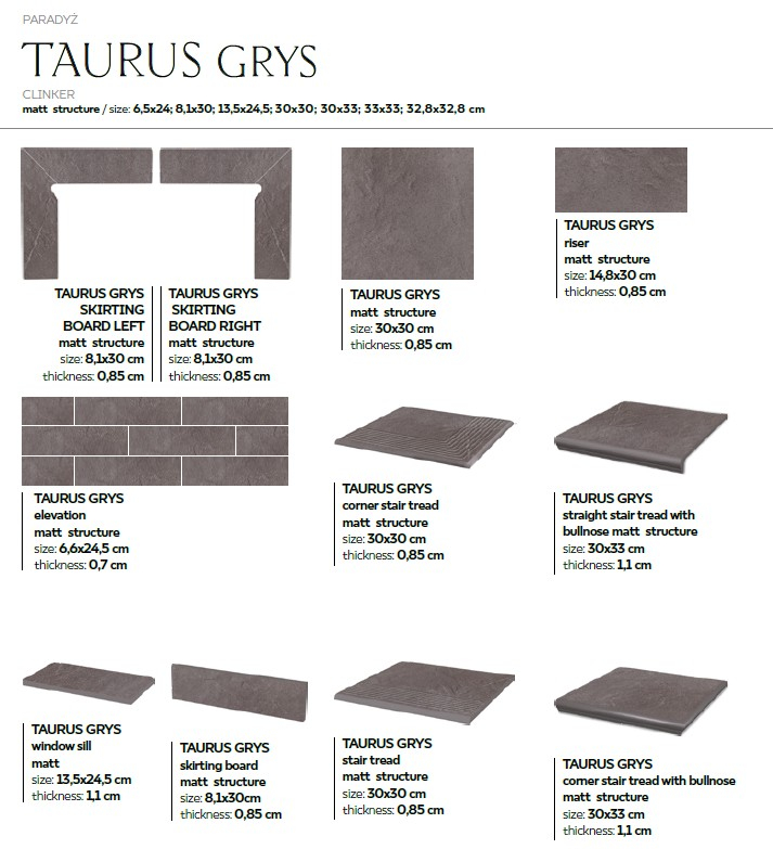 Modelul Taurus Grys este o placă de tip klinker realizată pentru finisaje de înaltă performanţă, ce se pot folosi atât în spaţii interioare (holuri, livinguri) cât şi în zone exterioare (terasă, balcon, scări). Principala dimensiune listată este 30 × 30 cm. Producţia se realizează prin tehnologia klinker, material ceramic ars la temperaturi înalte, cu rezistenţă sporită la uzură, la schimbările de temperatură (inclusiv cicluri îngheţ/dezgheţ) şi absorbţie redusă de apă.