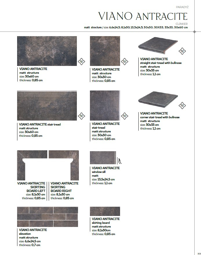 Colecția versatilă Viano de plăci de clincher, în nuanțe neutre de bej, nisip și antracit, se potrivește de minune atât în decorurile moderne, cât și în aranjamentele clasice. Textura subtilă, inspirată din natură și modelul delicat, în tonuri, se inspiră direct din minunata lume a naturii. Colecția versatilă include plăci de bază (30x30 cm, 30x60 cm), plăci pentru colțuri și trepte drepte (30x30 cm și 30x60 cm), socluri (8,1x30 cm), plăci sub trepte (14,8x30 cm), plăci pentru fațade (6,6x24,5 cm) și plăci pentru pervaz (10x20 cm). Multitudinea de formate combinate cu parametrii tehnici superiori permite utilizarea gresiei Viano pe pereții și podelele din întreaga proprietate: de la salon, scări și terasă până la fațadă.