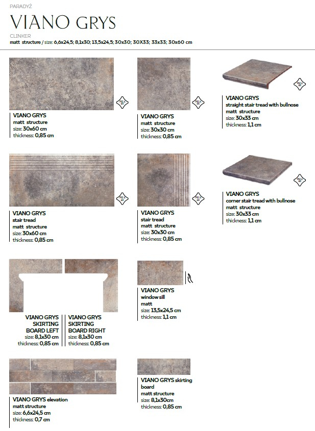 Colecția versatilă Viano de plăci de clincher, în nuanțe neutre de bej, nisip și antracit, se potrivește de minune atât în decorurile moderne, cât și în aranjamentele clasice. Textura subtilă, inspirată din natură și modelul delicat, în tonuri, se inspiră direct din minunata lume a naturii. Colecția versatilă include plăci de bază (30x30 cm, 30x60 cm), plăci pentru colțuri și trepte drepte (30x30 cm și 30x60 cm), socluri (8,1x30 cm), plăci sub trepte (14,8x30 cm), plăci pentru fațade (6,6x24,5 cm) și plăci pentru pervaz (10x20 cm). Multitudinea de formate combinate cu parametrii tehnici superiori permite utilizarea gresiei Viano pe pereții și podelele din întreaga proprietate: de la salon, scări și terasă până la fațadă.