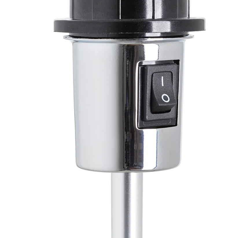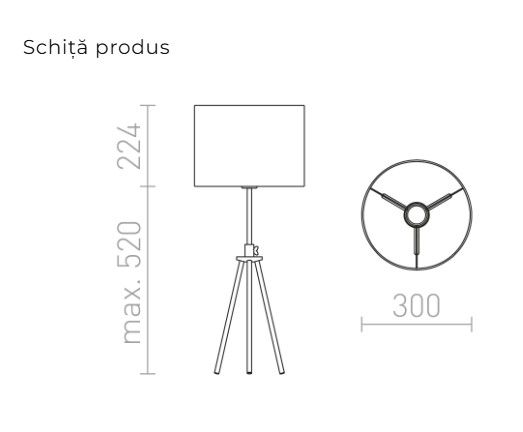 Lampă de masă pe trepied cu posibilitatea de reglare a înălțimi și abajur textil pentru bec cu soclu E27.