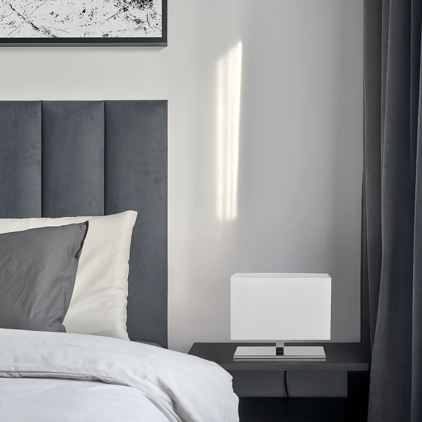 Corp de iluminat de masă cu abajur textil structurat.