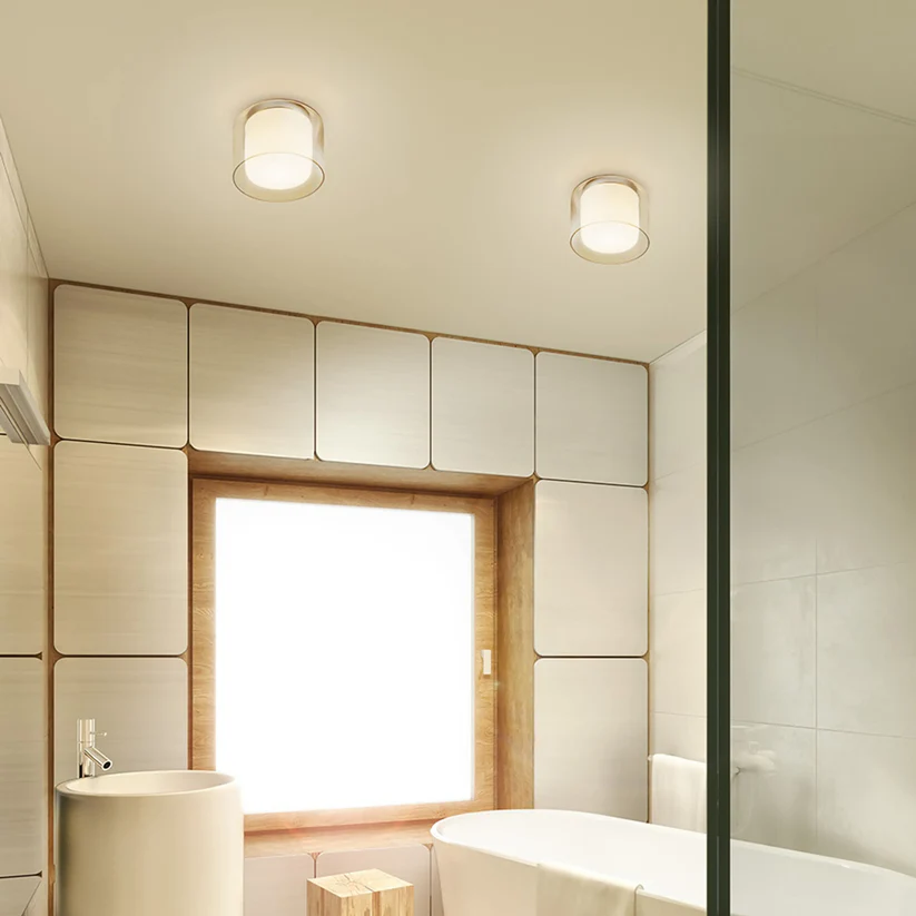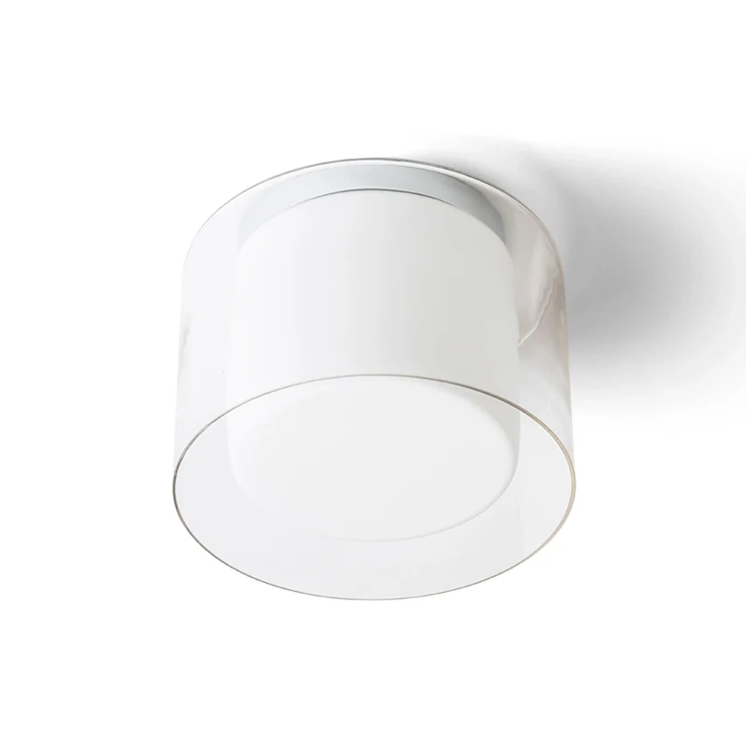 Lumina de tavan cu o nuanță combinată formată din sticlă exterioară transparentă și sticlă interioară de culoare opal, pe o bază cromată cu o priză E27 pentru surse de lumină LED. Potrivit pentru utilizare în băi.
