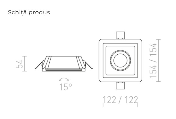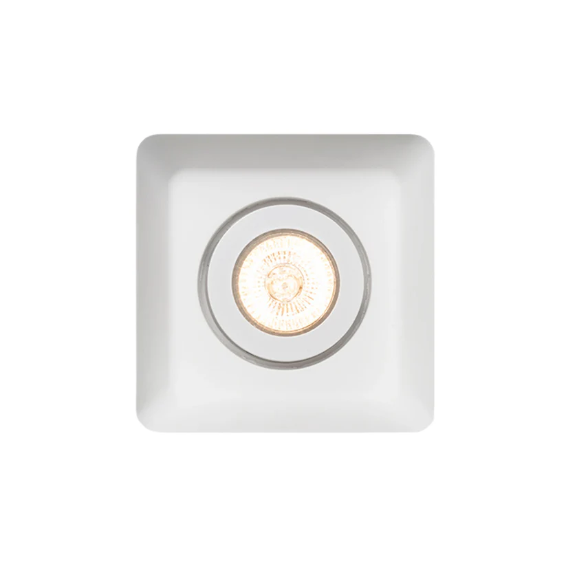 Corp de iluminat din gips cu gaură pătrată și finisaj fără ramă. Montare doar în plăci de rigips. Corpul de iluminat poate fi vopsit în culori interioare.