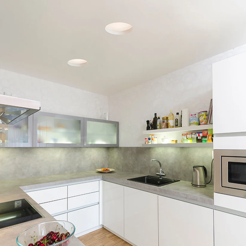 Corp de iluminat încastrat din gips cu abajur din policarbonat mat. Fără ramă. Montare doar în tavan din rigips.