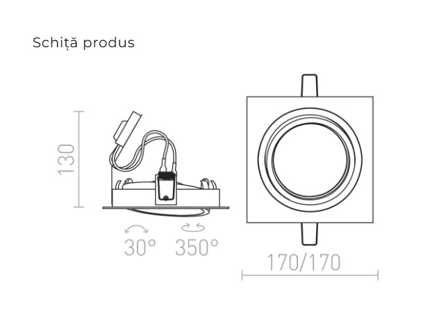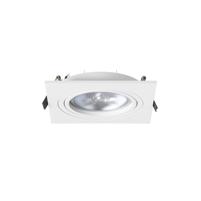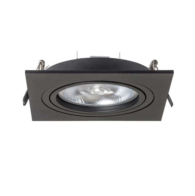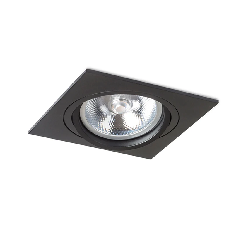 Corp de iluminat pătrat încastrat, realizat din aluminiu cu suprafață naturală, disponibil în două versiuni lăcuite. Dispune de posibilitate de înclinare, permițând orientarea direcționată a luminii, fiind compatibil cu bec AR111.