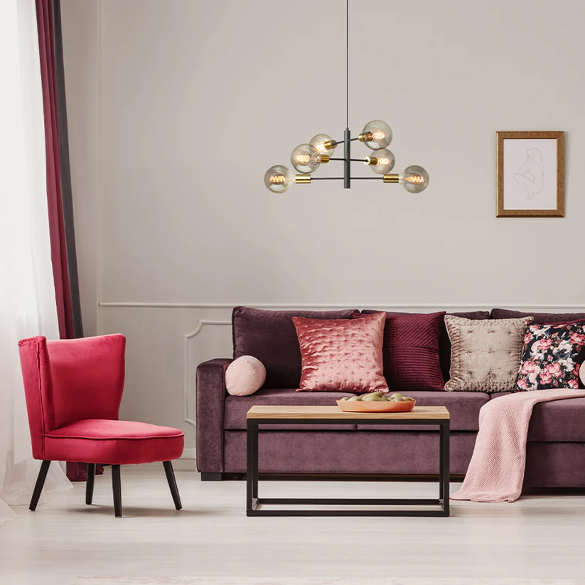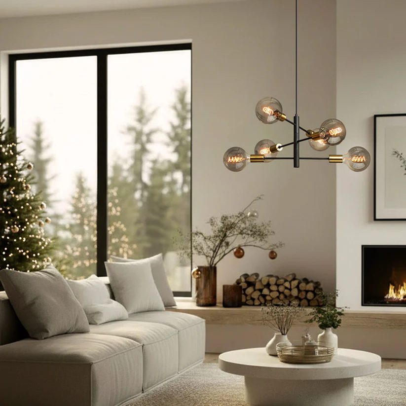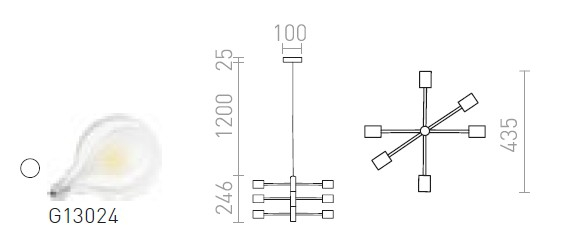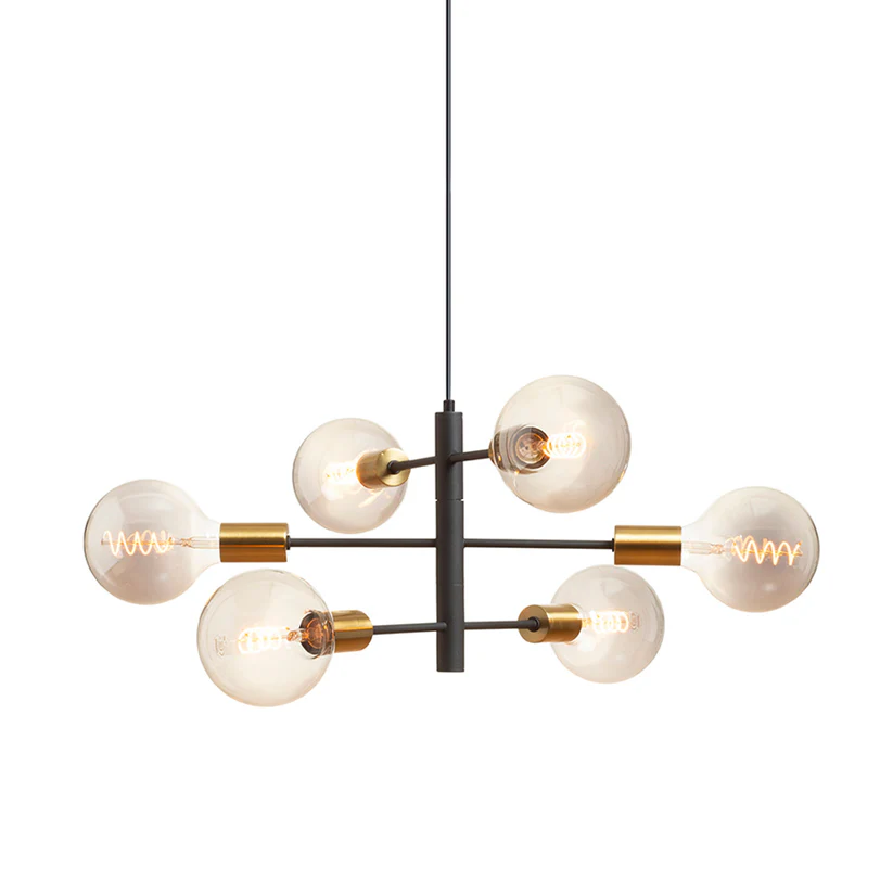 Pandantiv de designer prevăzut cu capace decorative din alamă pentru prize, ce oferă un aspect sofisticat și modern. Dispozitivul poate fi modelat prin ajustarea brațelor de-a lungul axei orizontale, permițând personalizarea formei și direcției luminii în funcție de spațiu și preferințe.