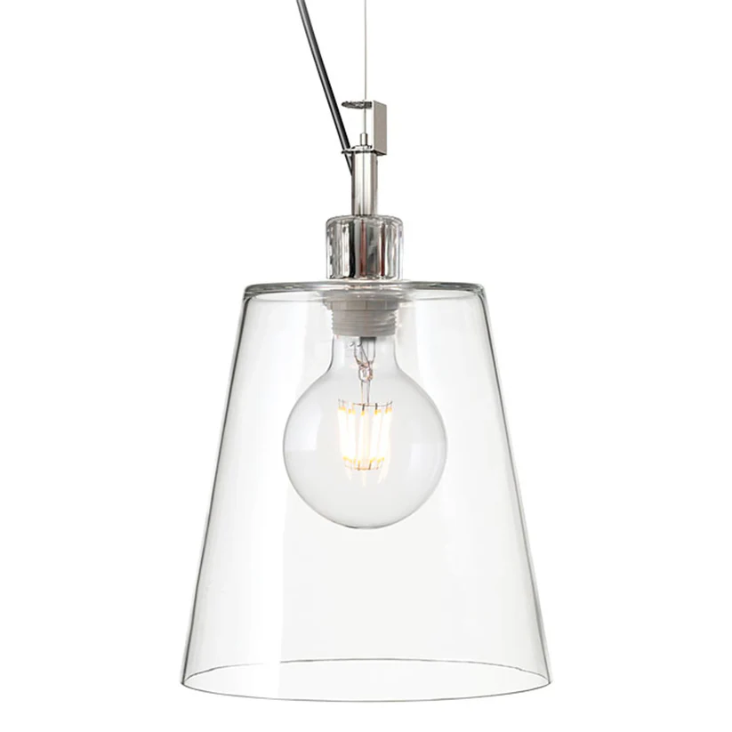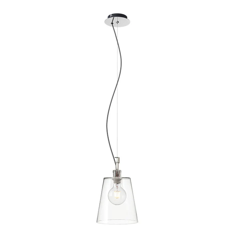 Corp de iluminat suspendat cu abajur din sticlă, disponibil în două variante de culoare, cu bază de tavan cromată, potrivit pentru interioare moderne și elegante. Oferă un iluminat decorativ plăcut, ideal pentru living, dining sau spații comerciale.