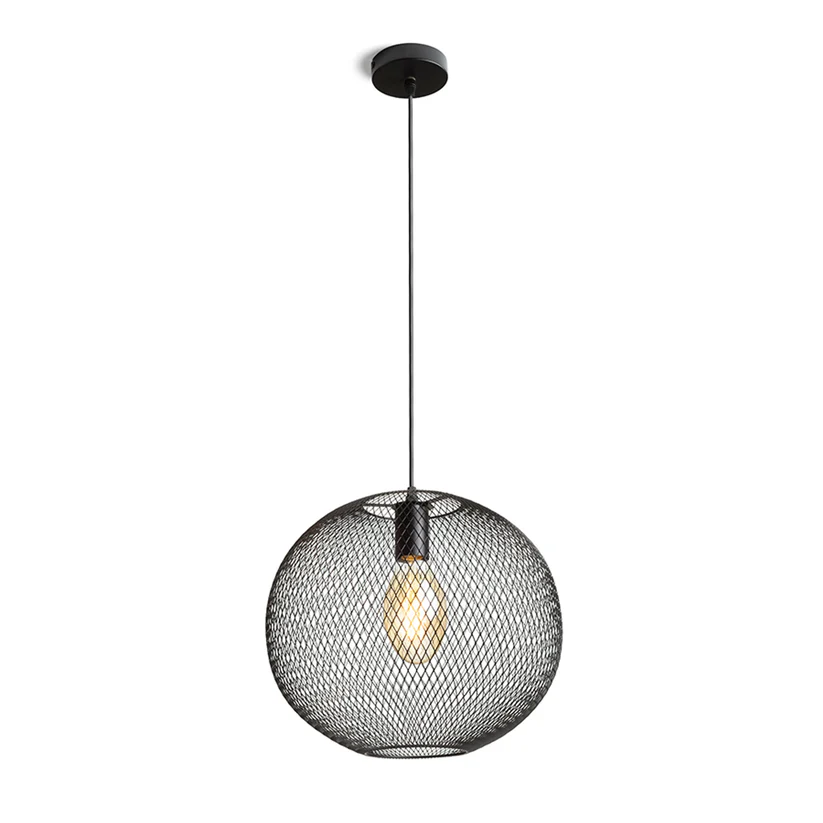 COSIR 34 – Corp de iluminat suspendat este un pandantiv cu abajur sferic realizat din plasă de sârmă fină, care creează un efect decorativ spectaculos prin jocul de lumini și umbre. Este potrivit pentru becuri LED decorative cu dulie E27, punând în valoare forma și designul sursei de lumină.
