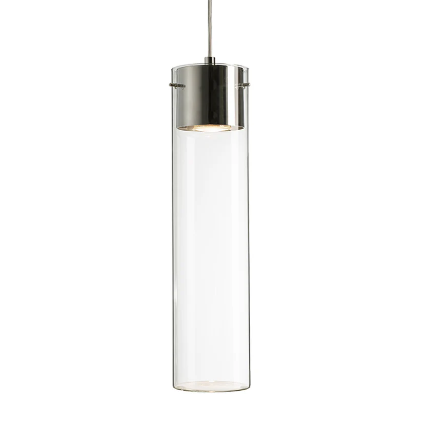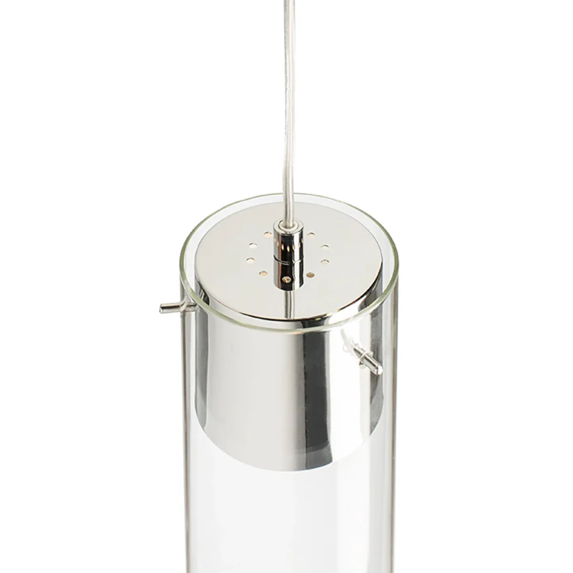 Corp de iluminat suspendat cu bază cromată și abajur din sticlă transparentă. Abajurul de sticlă este închis în partea de jos și este posibil să introduceți decorațiuni adecvate.