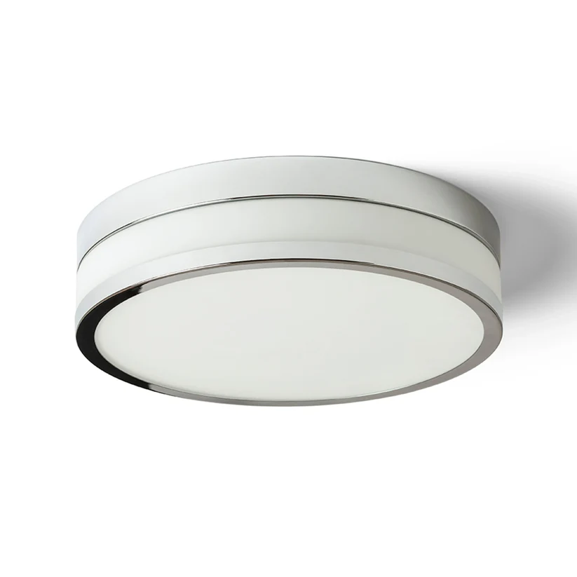 Lampă rotundă de plafon cu LED integrat, cu abajur din sticlă plată opal și cadru metalic rezistent. Oferă o iluminare uniformă și plăcută și este potrivită pentru medii umede, precum băi sau bucătării, datorită clasificării IP44, combinând funcționalitatea cu designul modern.