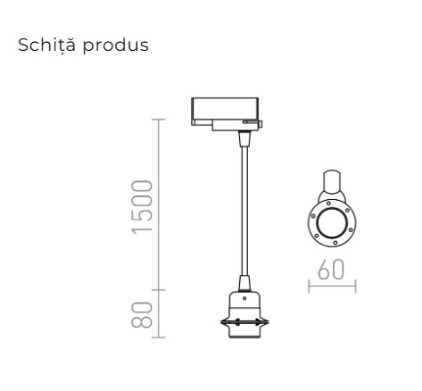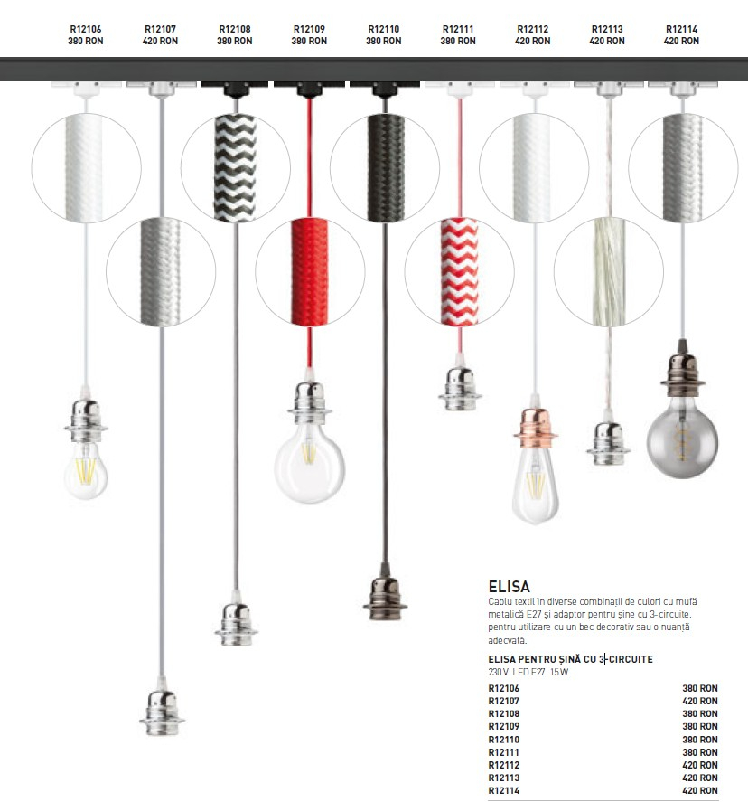 Cablu textil disponibil în diverse combinații de culori, echipat cu mufă metalică E27 și adaptor pentru șinele cu 3 circuite. Ideal pentru utilizarea cu un bec decorativ sau cu un abajur potrivit.