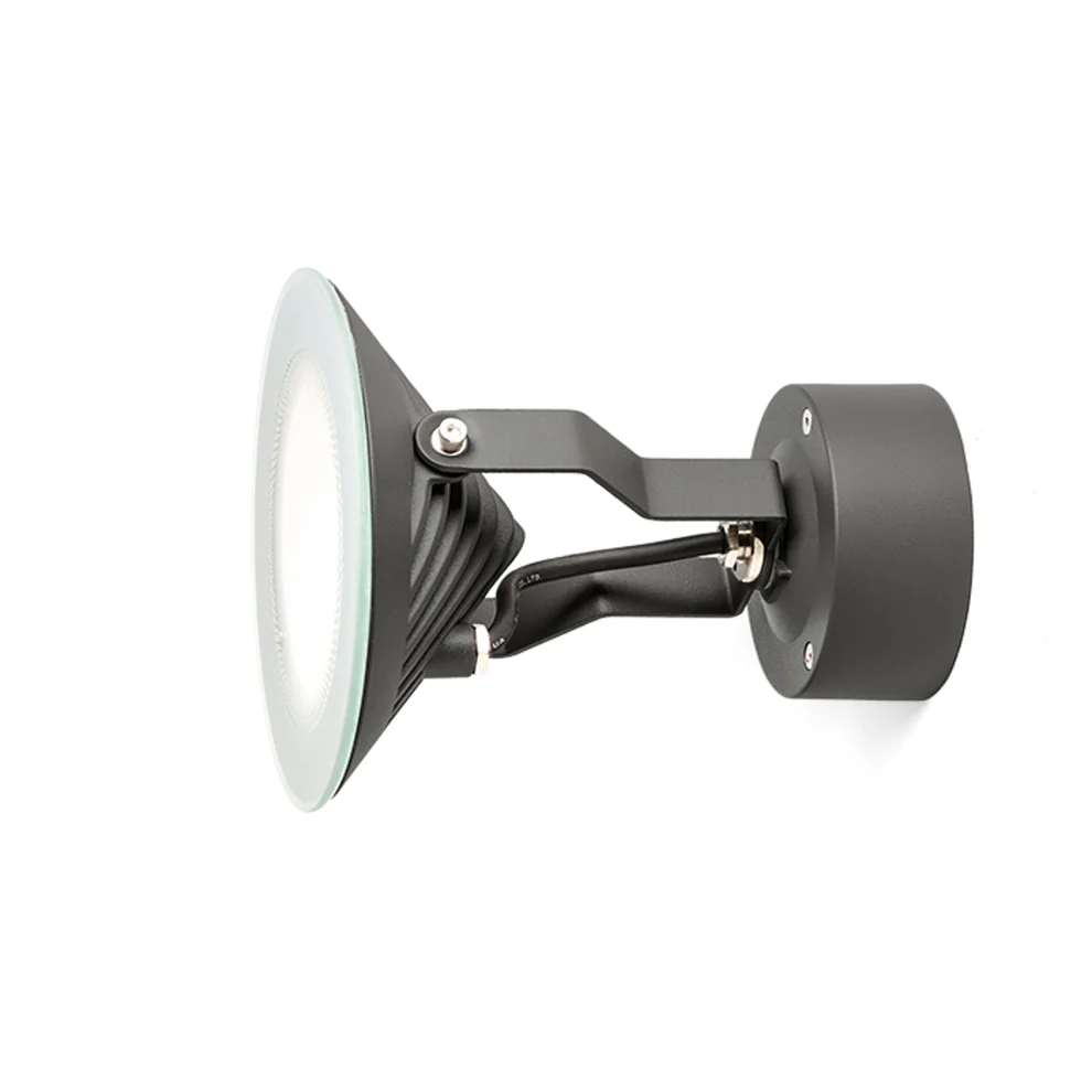 Reflector LED reglabil exterior cu capac din sticlă transparentă, pentru montare pe perete. Pentru instalarea în grădină, este posibilă completarea vârfului în sol (R11755).