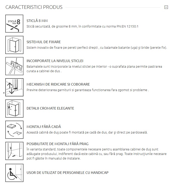 Realizată din sticlă securizată de înaltă calitate, cabina garantează durabilitate și siguranță în utilizarea zilnică. Profilul metalic cu finisaj Chrome+ conferă un aspect premium și oferă stabilitate pe termen lung.