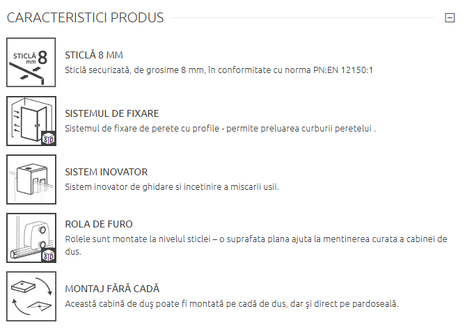 Realizată din sticlă securizată de 8 mm, cabina garantează durabilitate și siguranță în utilizarea zilnică, respectând standardele europene. Sistemul de prindere permite ajustarea la eventualele denivelări ale peretelui, pentru o instalare corectă.