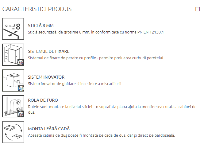 Realizată din sticlă securizată de 8 mm, cabina garantează durabilitate și siguranță în utilizarea zilnică . Sistemul de role este poziționat inteligent pentru a facilita curățarea și întreținerea.