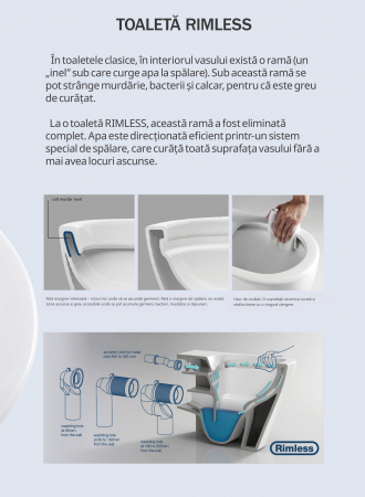 Vasul de WC nu are marginea clasică pe interior (sub care se ascund de obicei murdărie și bacterii).  Apa clătește uniform toată suprafața interioară, iar curățarea este mult mai ușoară și igiena este superioară.