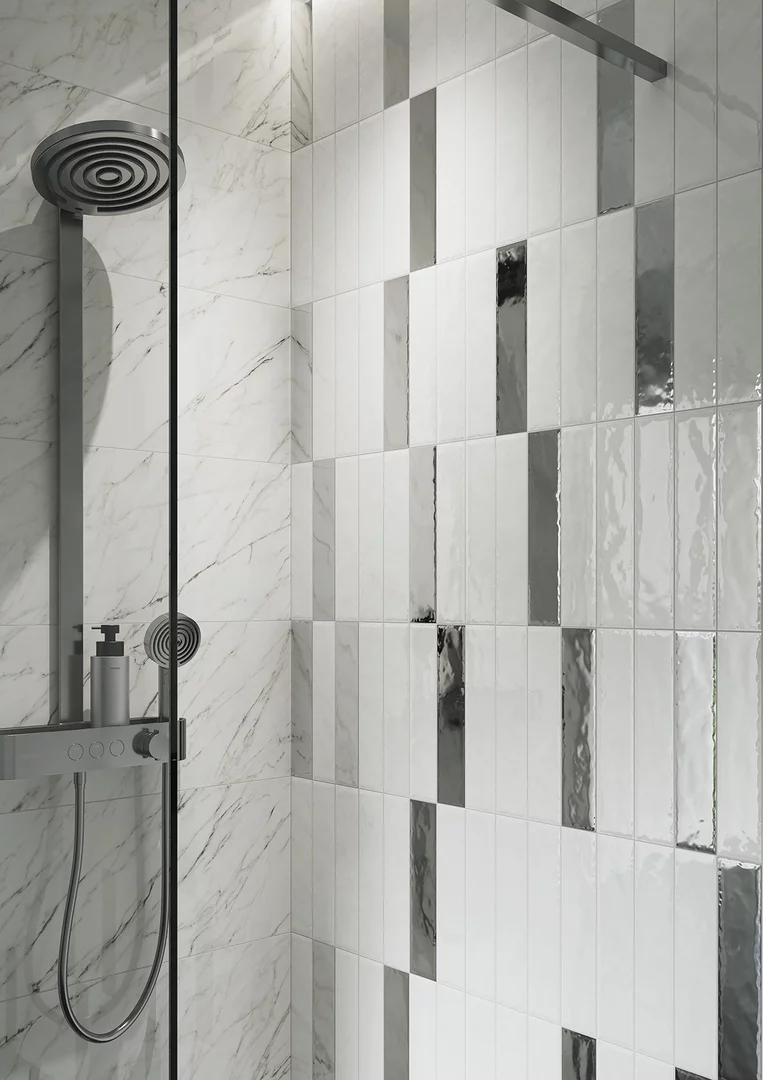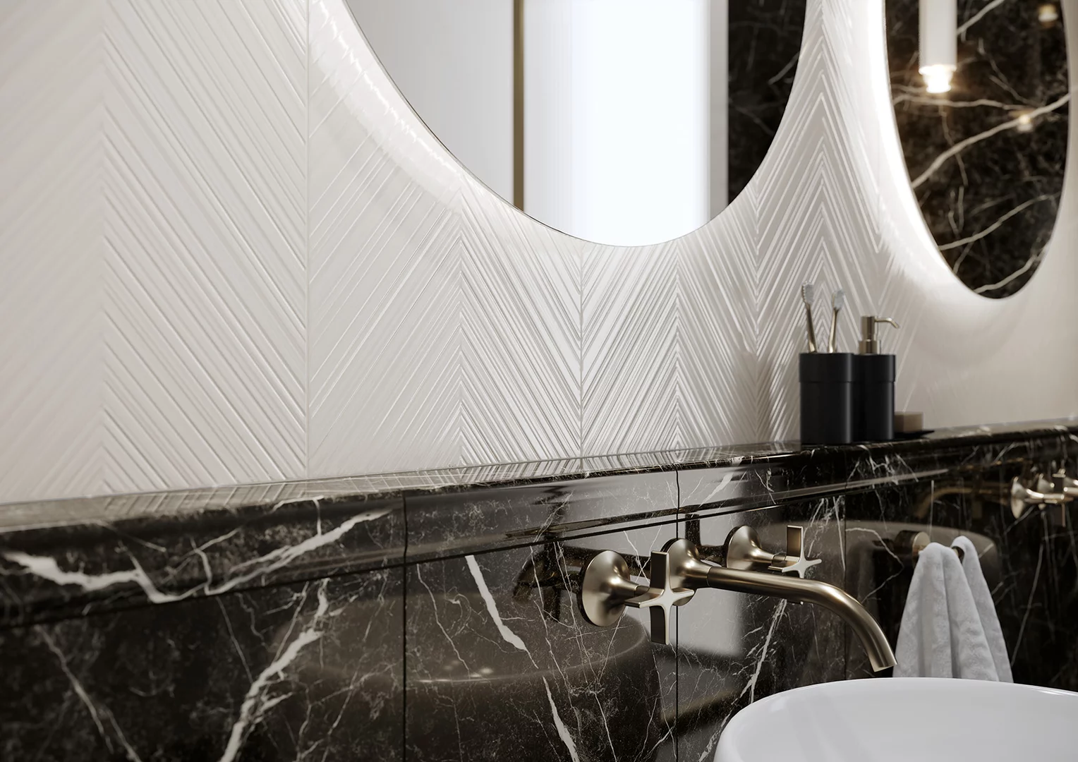 Plăcile ceramice din colecție sunt disponibile în dimensiuni de 29,8 × 89,8 cm și 29,8 × 6,5 cm, cu finisaje lucioase care reflectă subtil lumina, creând un efect vizual deosebit. Designul lor include modele elegante și structuri delicate, inspirate din marmura Statuario, oferind un aspect sofisticat și modern.