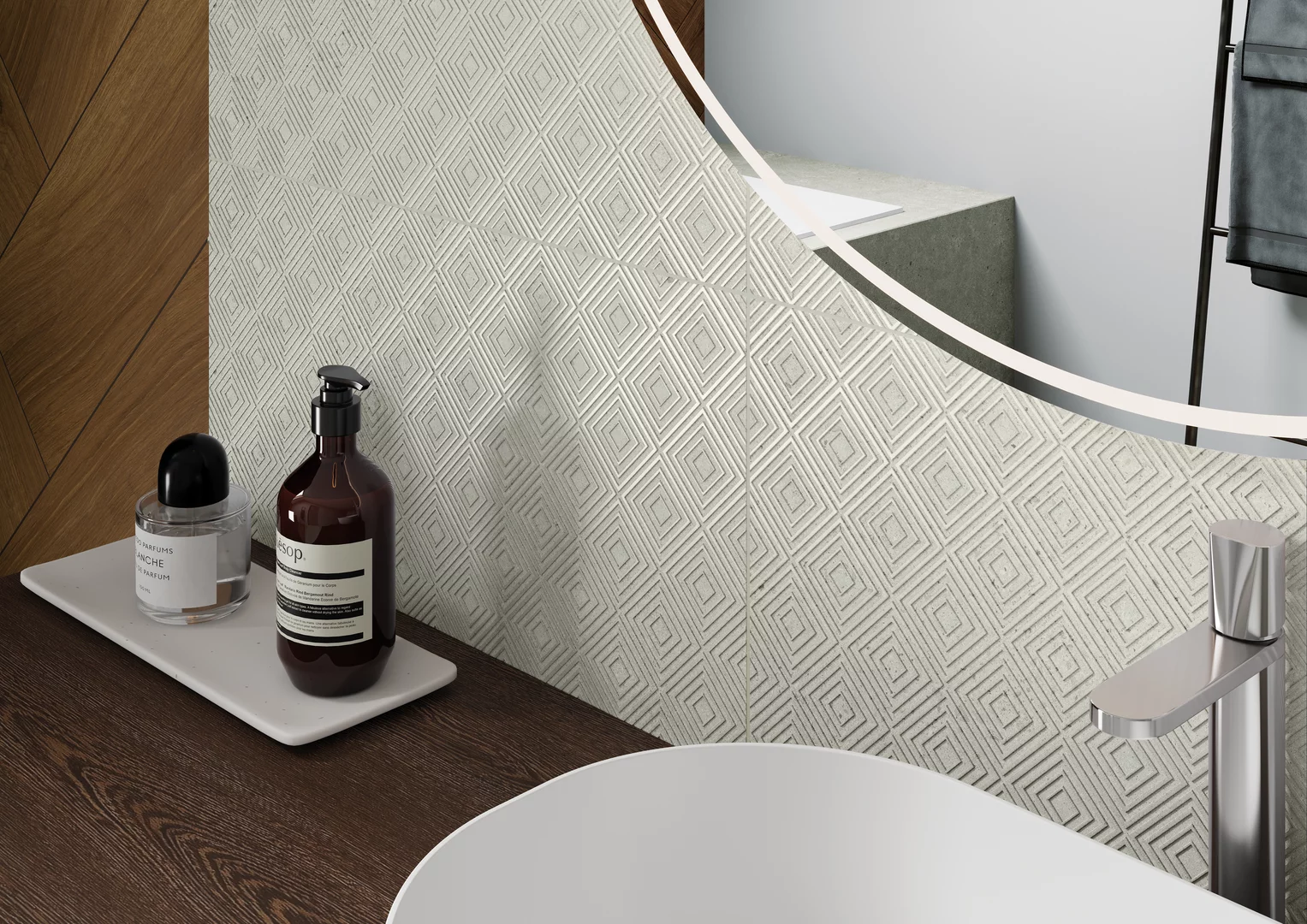 Nuanțele strălucitoare create prin aplicarea de cerneală lucioasă pe particulele foarte vizibile ale structurii de beton primesc un aspect extraordinar. Colecția este completată de plăci decorative de perete în format 29,8x59,8 mm în culorile luminoase White și Crema. Acestea au un efect fenomenal de strălucire a modelului, care poate fi simțit și la atingere.