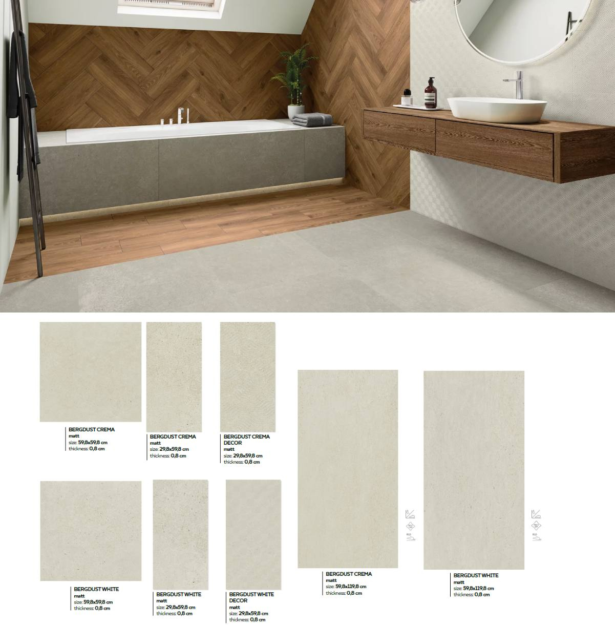 Bergdust este inspirat de betonul discret, cu granulația fină caracteristică. Nuanțele calme și neutre White, Crema, Grey și Beige pe suprafețe mate se potrivesc perfect atât cu stilurile moderne, cât și cu cele mai clasice de interior. Este o bază versatilă pentru numeroase aranjamente, atât minimaliste, precum și mai complexe.