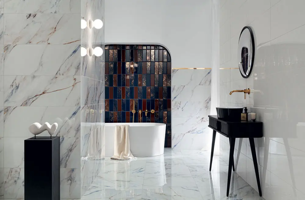 Colecția Blue Stone poartă amprenta rafinamentului mediteranean, inspirată de frumusețea naturală a marmurei și de vibrația artistică a ceramicii andaluze. Textura sa delicată, străbătută de vinișoare albastre, creează o bază elegantă, completată de nuanțe profunde de burgund și albastru care evocă noblețea pietrei naturale.