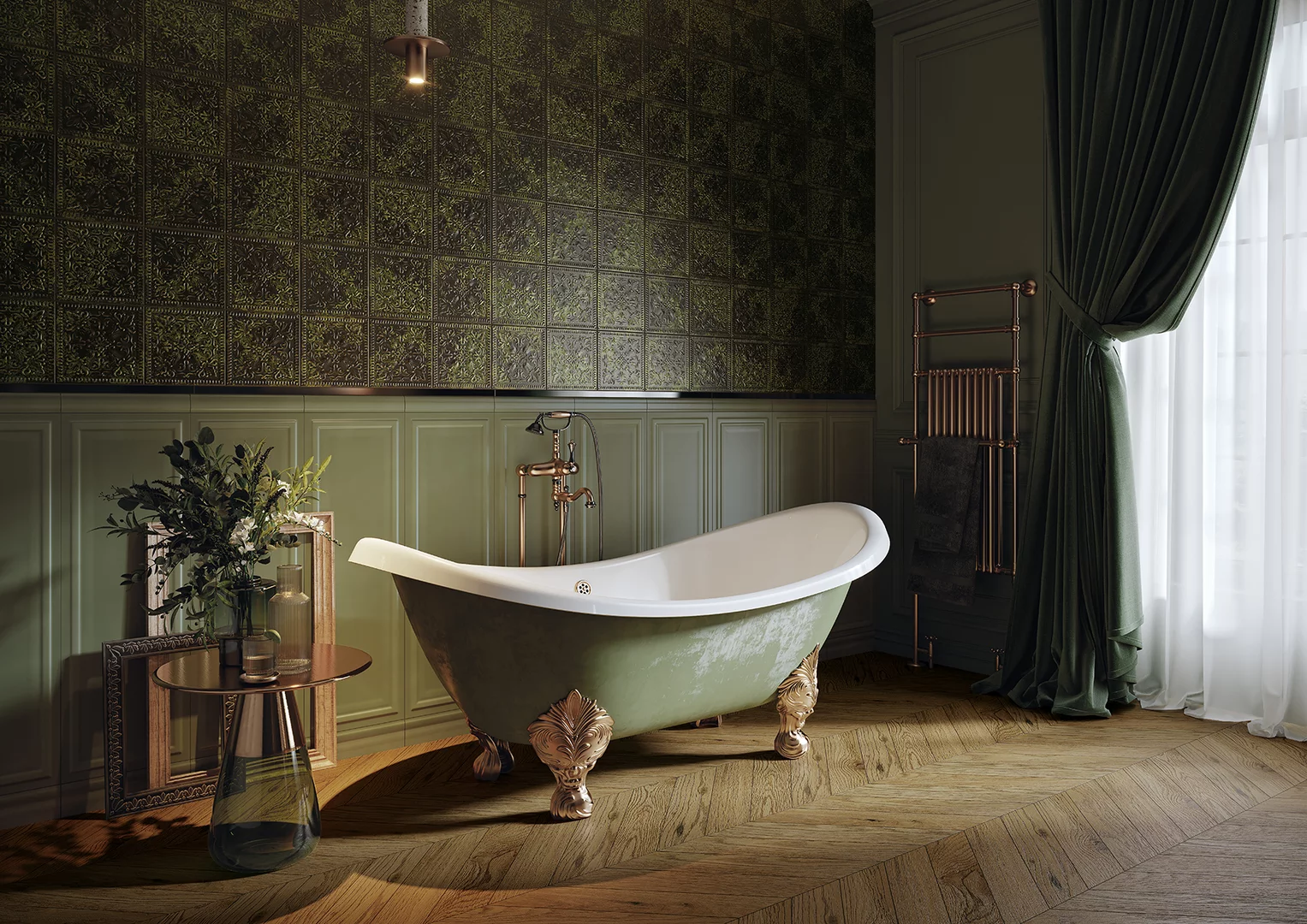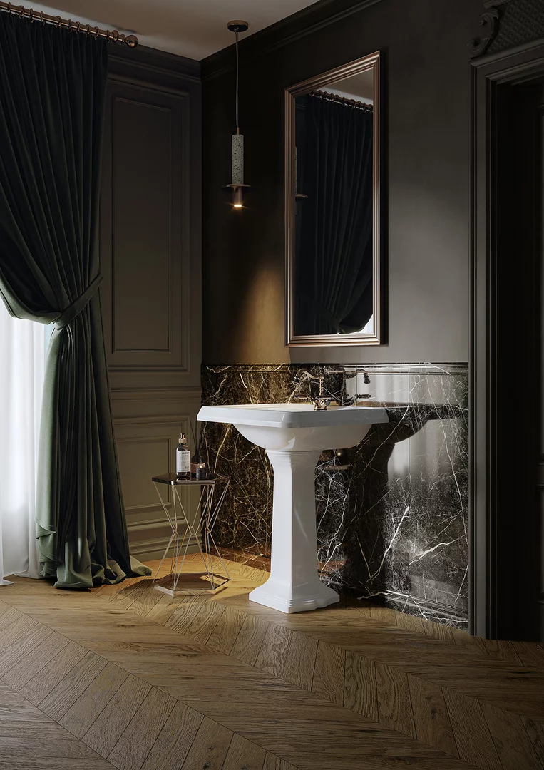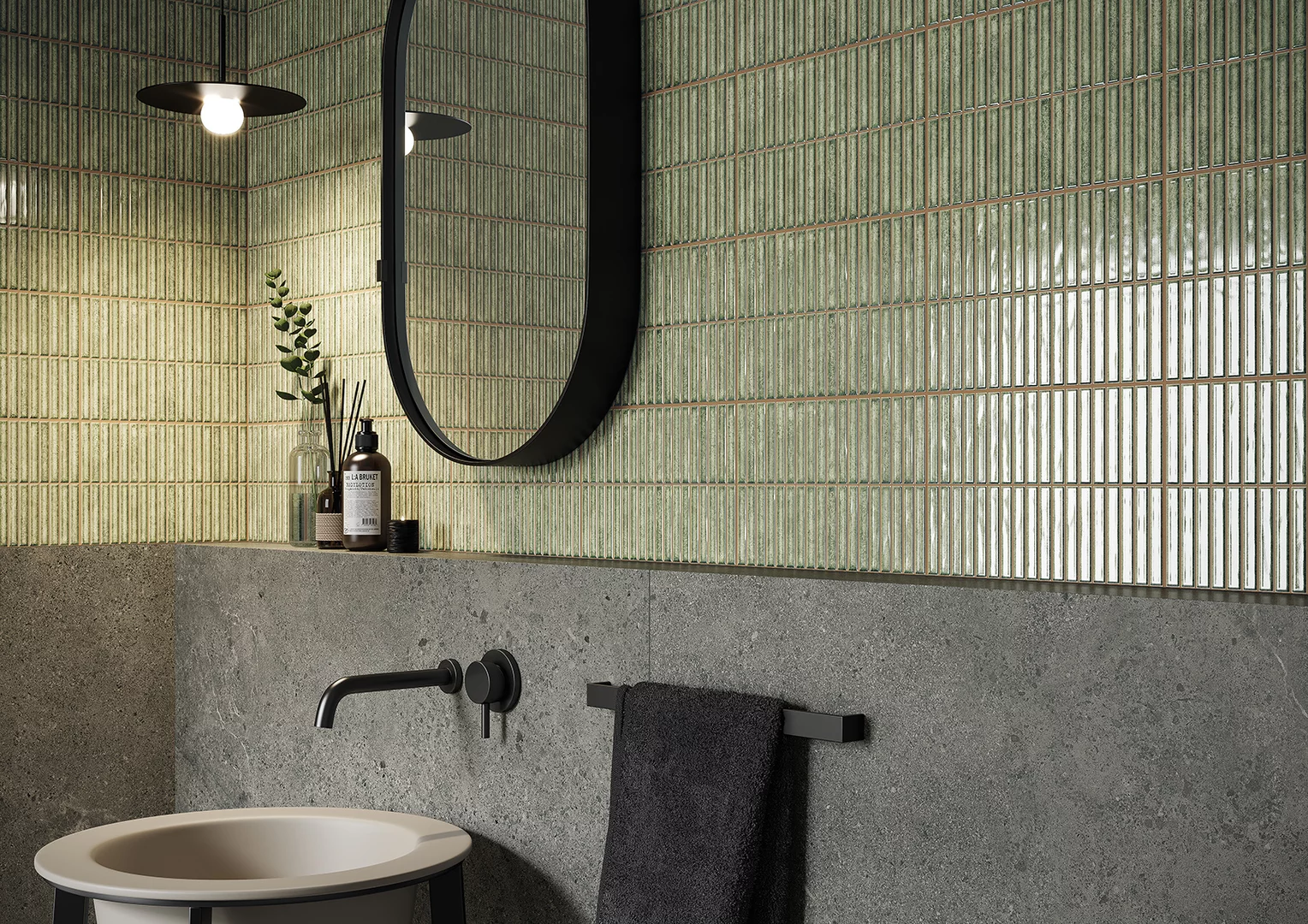 Privindu-le, veți simți aproape mirosul plantelor și al sălbăticiei neexplorate a naturii învăluite într-o subtilă ceață de mister. Culoarea verde măsliniu a plăcilor, care se referă la panouri de perete sau plăci cu structura unei plăci de sobă inspirate de măiestria ceramicii tradiționale, va crea un sentiment de siguranță și stabilitate.