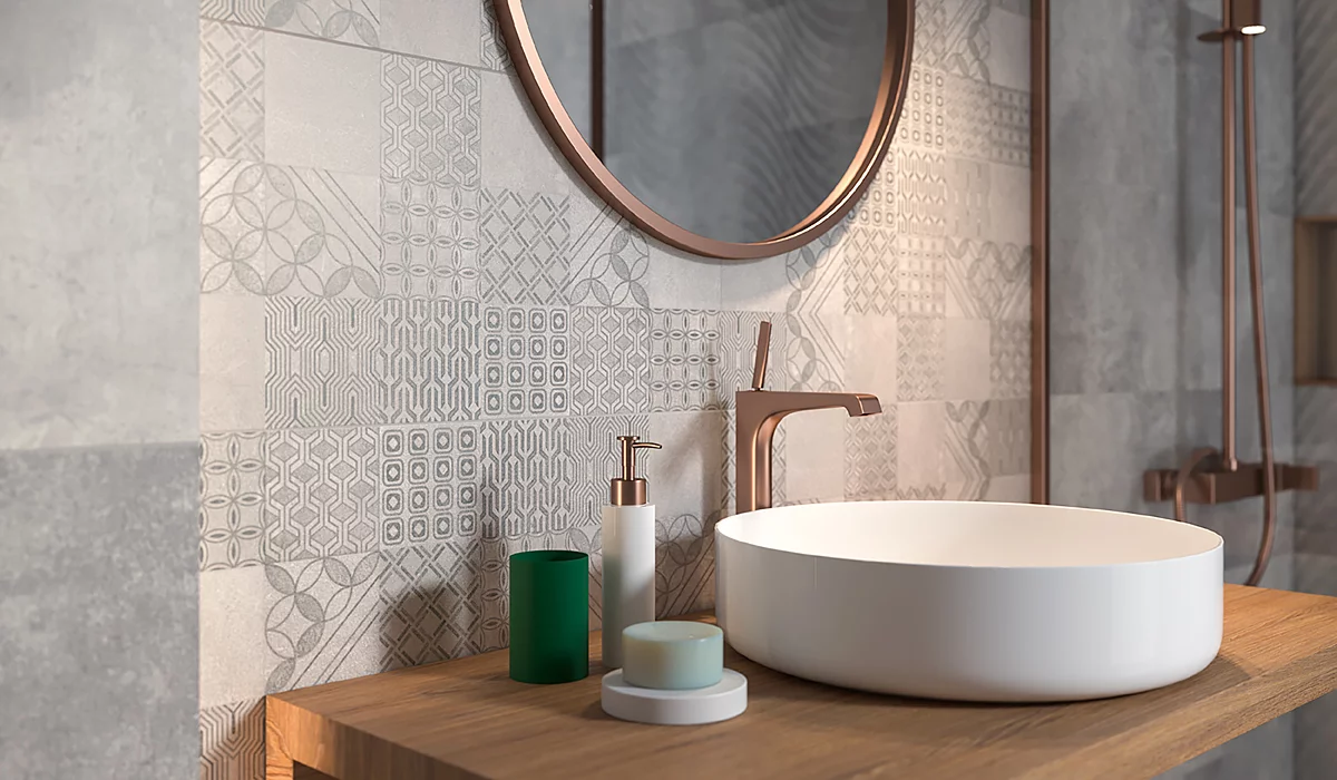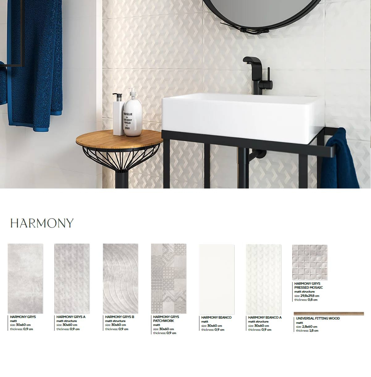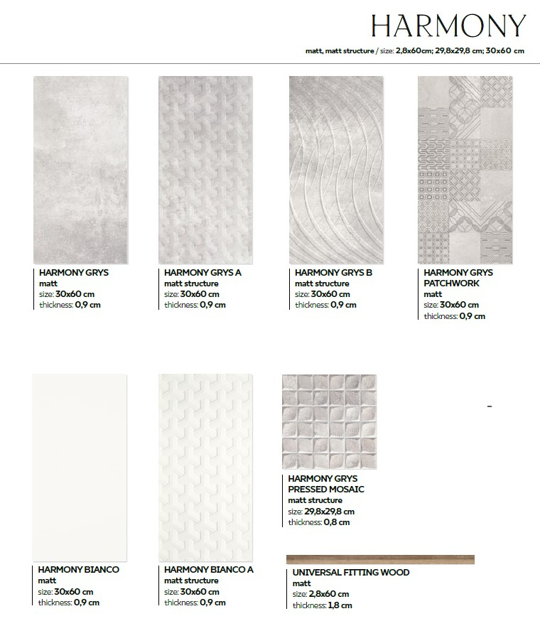 În colecția HARMONY veți găsi plăci de pardoseală și de perete în nuanțe de gri atemporale. Structurile luminoase, modelele geometrice minimaliste și accesoriile contrastante din lemn vă asigură posibilități de amenajare excepționale.