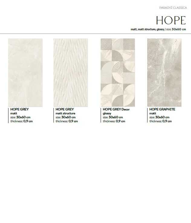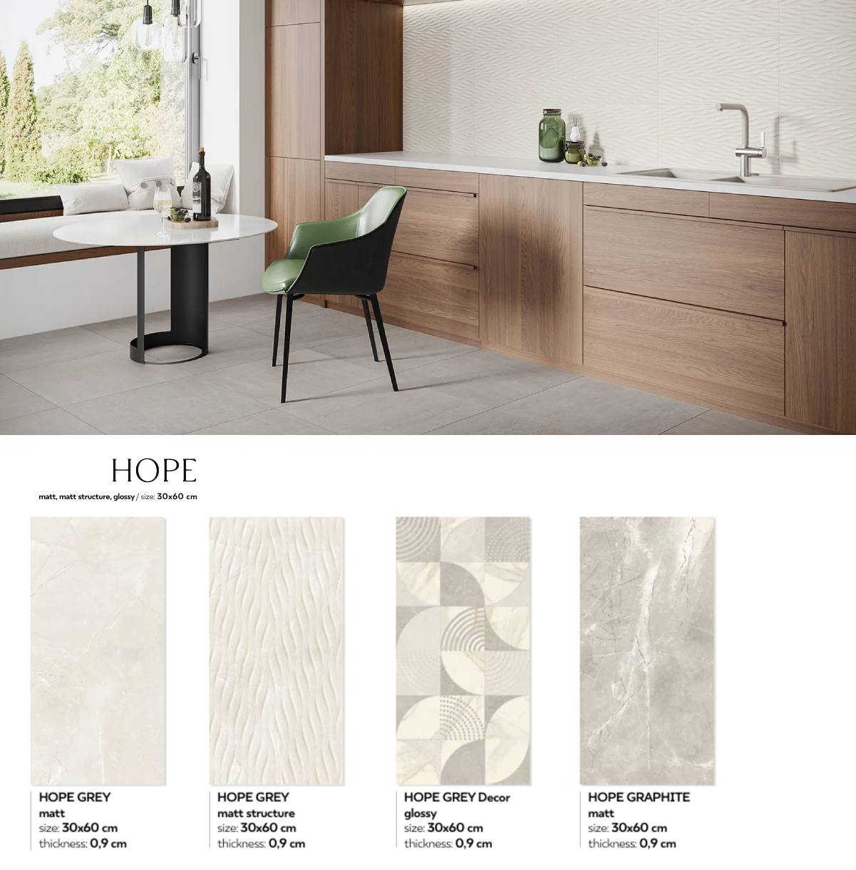 Umpleți-vă casa cu nimic altceva decât energie pozitivă, lăsați să conteze ceea ce este mai important – cei dragi vouă. Colecția Hope este o combinație de clasic și modernitate subtilă. Finisajul satinat și delicat la atingere al plăcilor va conferi eleganță interiorului creat. În schimb caracterul modern va fi accentuat de decorul geometric într-o combinație inedită de pietre pulpis și calacatta, care, datorită efectelor speciale folosite, se joacă în mod permanent cu lumina. Casa Dumneavoastră de Vis devine o încăpere plină de viață și stil.