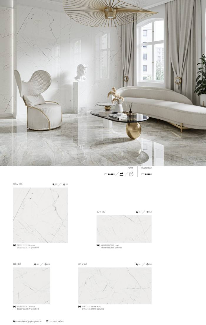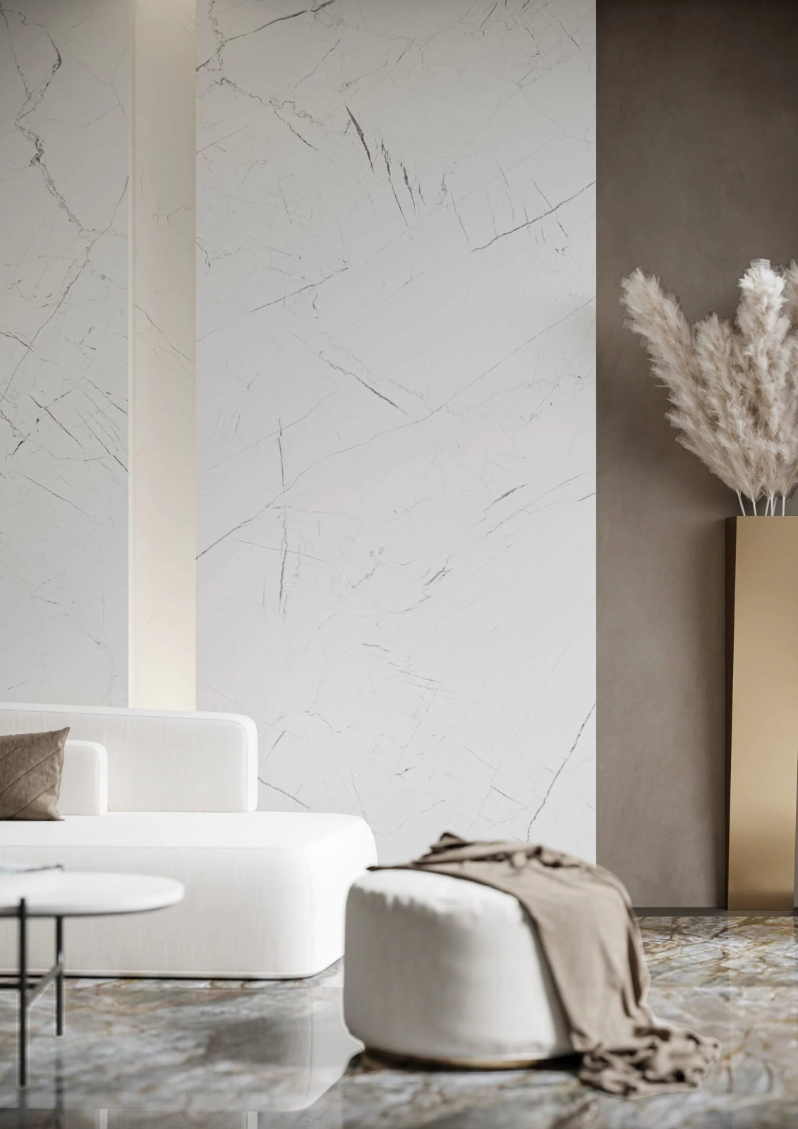Textura fină, uniformă și nuanța alb intens conferă spațiilor o senzație de aerisire și expansiune, reflectând lumina într-un mod subtil și sofisticat. Fiecare placă devine un element decorativ în sine, potrivită pentru interioare moderne, minimaliste sau premium, unde se dorește o atmosferă luminoasă și elegantă.