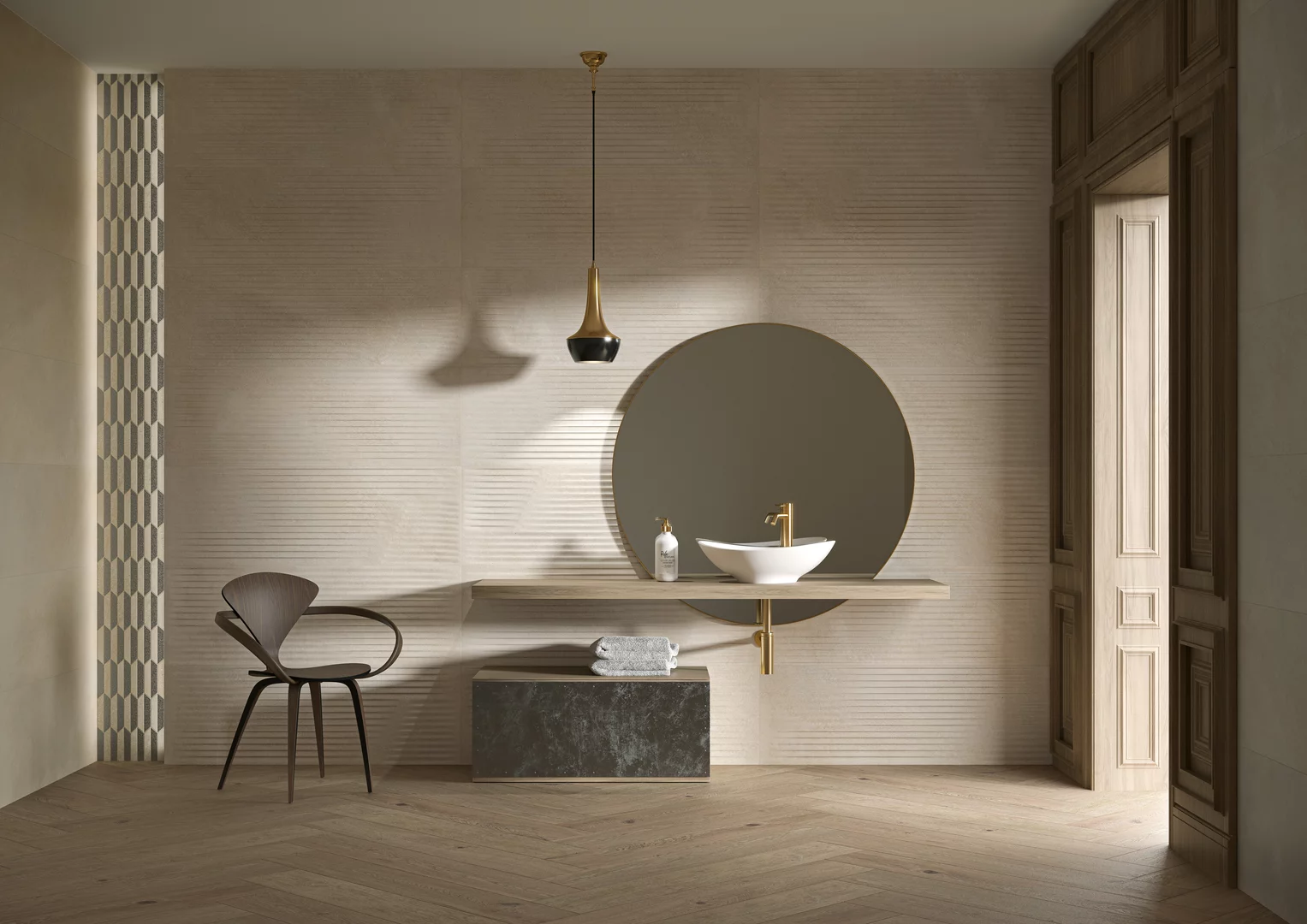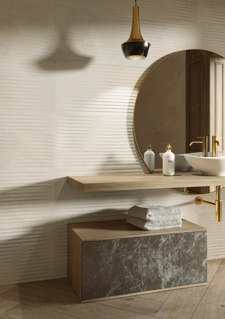 Imaginați-vă o țesătură moale, naturală, care se unduiește în briza verii. Delectați-vă de catifelarea acesteia în propria casă. Piatra de gresie caldă, de culoare bej, îi va da un aer minimalist, în stil boho, în timp ce mozaicul strălucitor cu o notă de platină completează ansamblul. Permiteți ca spațiul dumneavoastră să vă învăluie și să vă liniștească.
