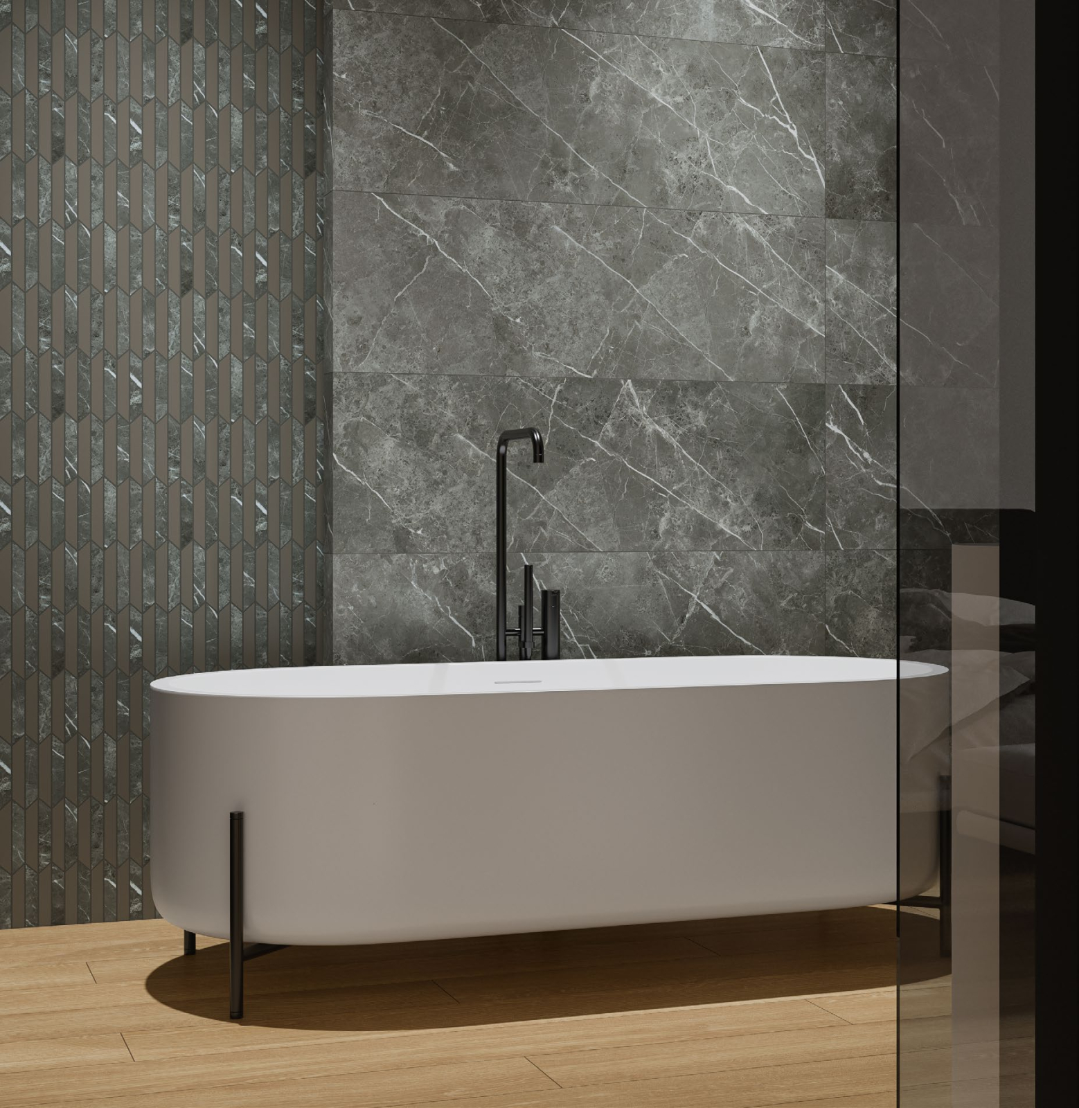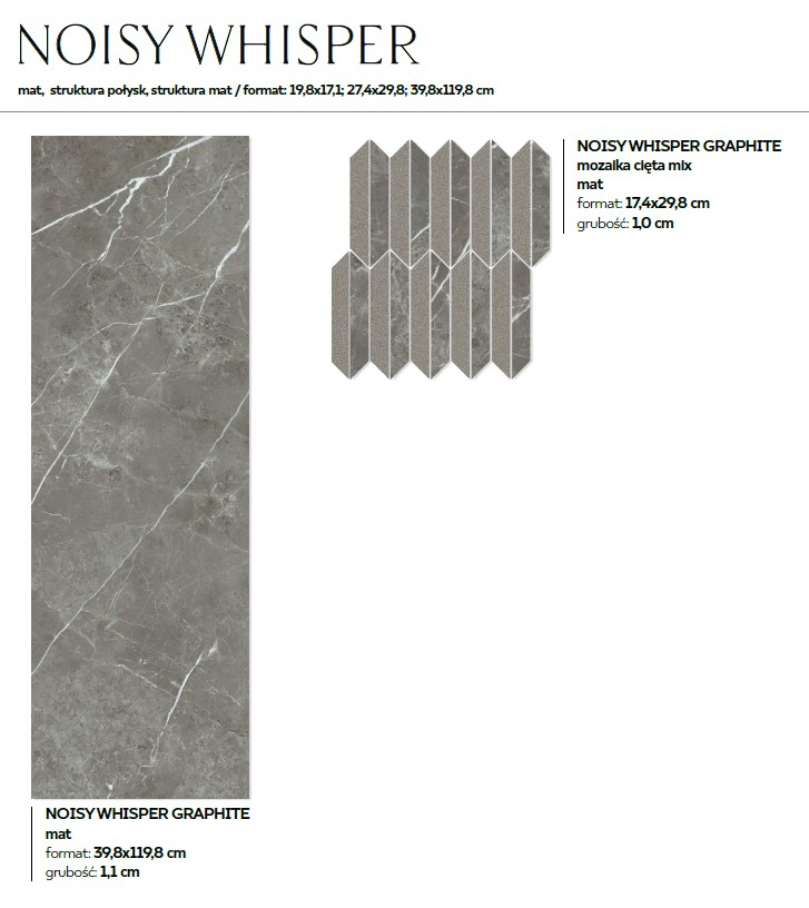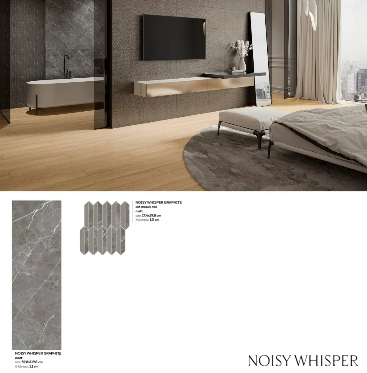 Colecția Noisy Whisper Graphite de la Paradyz aduce un aer sofisticat și modern în orice spațiu interior. Nuanța grafit, combinată cu textura inspirată din țesături cu efect de paiete, conferă pereților eleganță și rafinament. Plăcile de perete rectificate, cu dimensiunile de 39,8 × 119,8 cm și finisaj mat, permit crearea unor suprafețe continue și uniforme, perfecte pentru băi, bucătării sau zone de accent. Mozaicurile decorative cioplit-mixate completează ansamblul, adăugând un strop de glamour și stil sofisticat fiecărui interior.