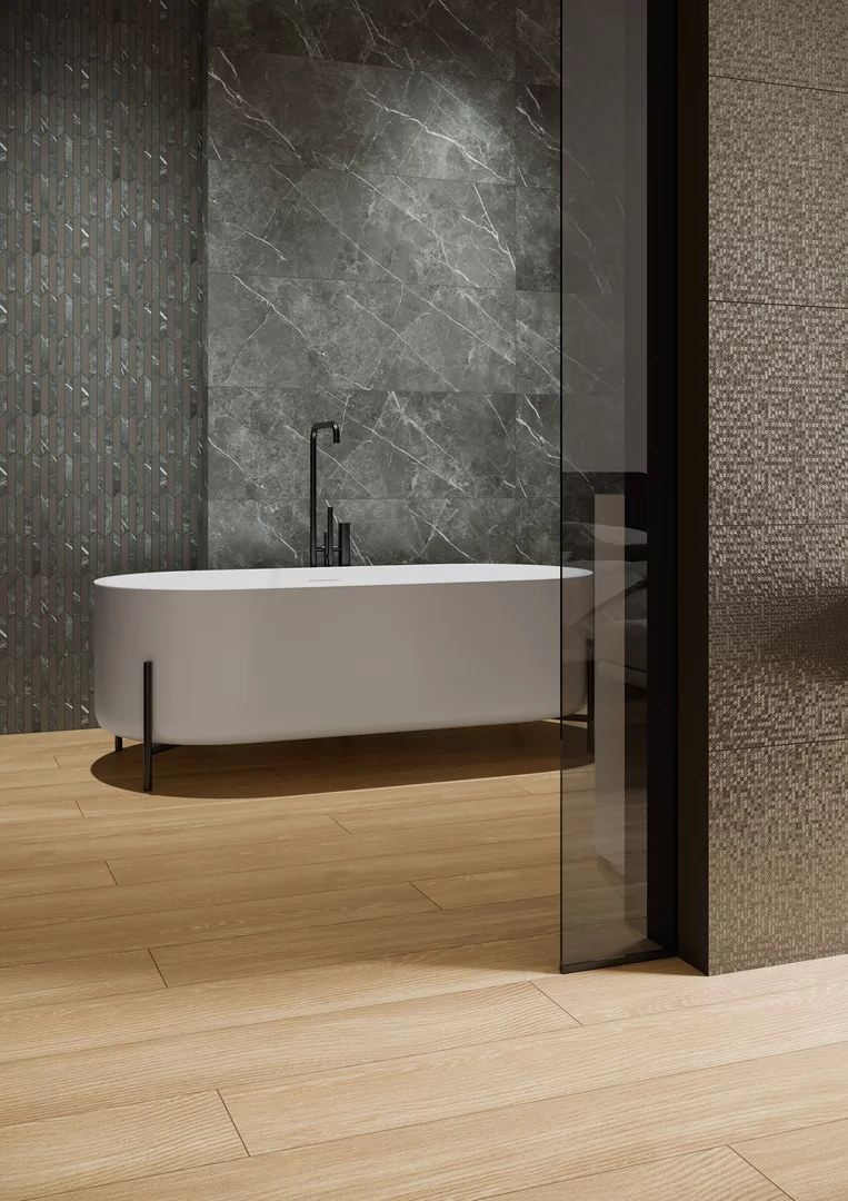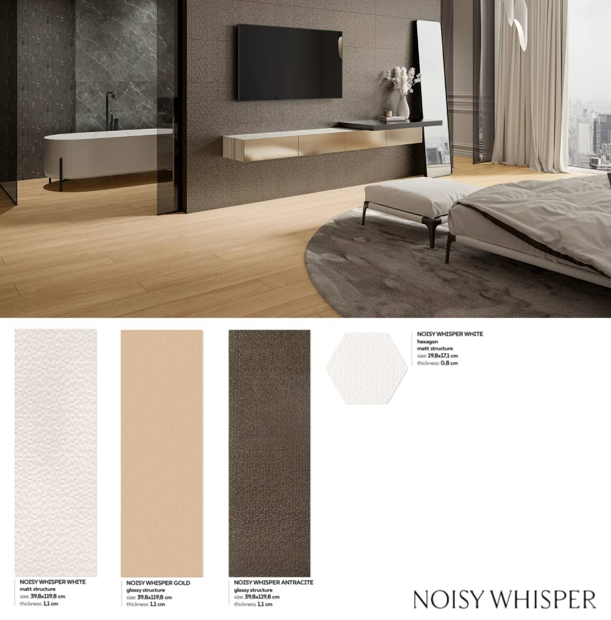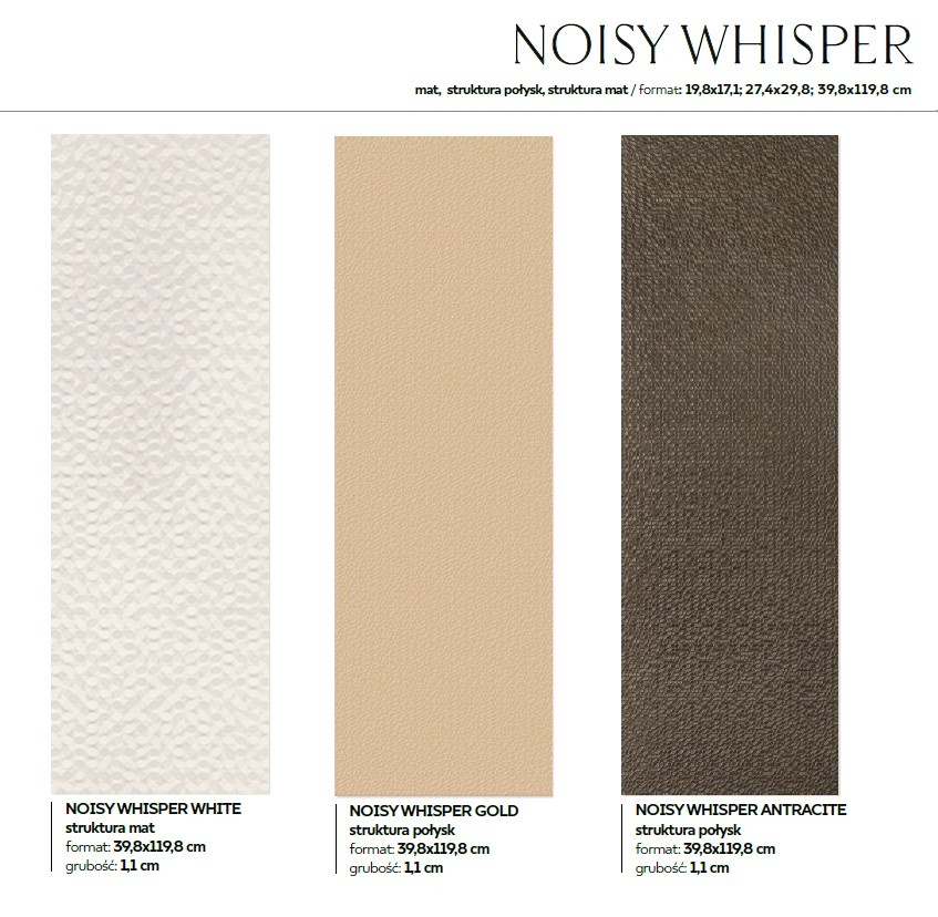 Colecția Noisy Whisper de la Paradyz aduce un aer sofisticat și modern în orice spațiu interior. Inspirată din texturi textile cu efect de paiete, această colecție transformă fiecare perete într-o piesă de design rafinată. Plăcile ceramice sunt disponibile în nuanțe precum alb, grafit, aur și antracit, fiecare cu finisaje lucioase sau mate, oferind un joc subtil de lumini și umbre. Dimensiunile standard de 39,8 × 119,8 cm și grosimea de 11 mm permit o instalare ușoară și un aspect uniform. Pentru a completa ansamblul, colecția include și mozaicuri decorative cu accente metalice, ideale pentru a adăuga un strop de glamour oricărei încăperi.