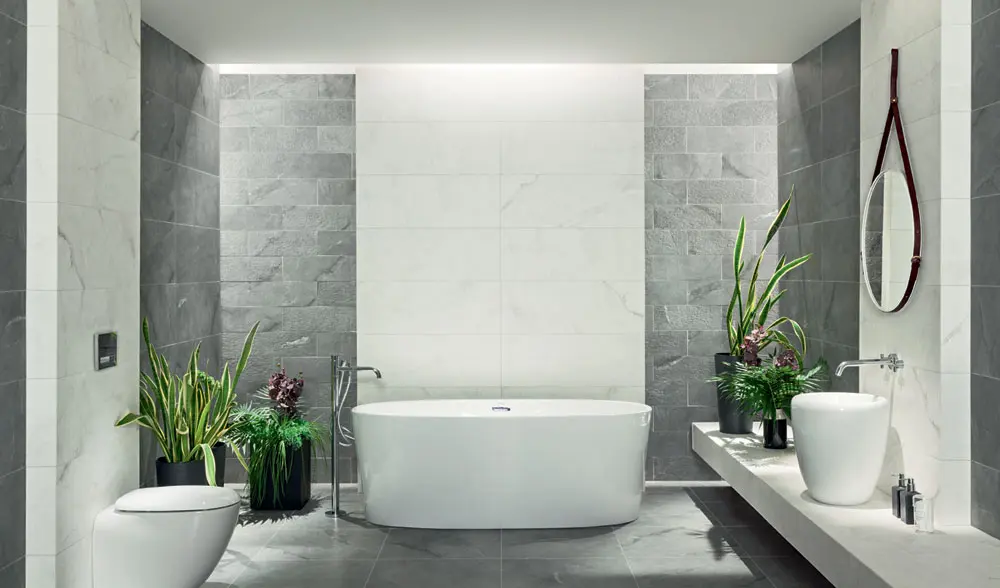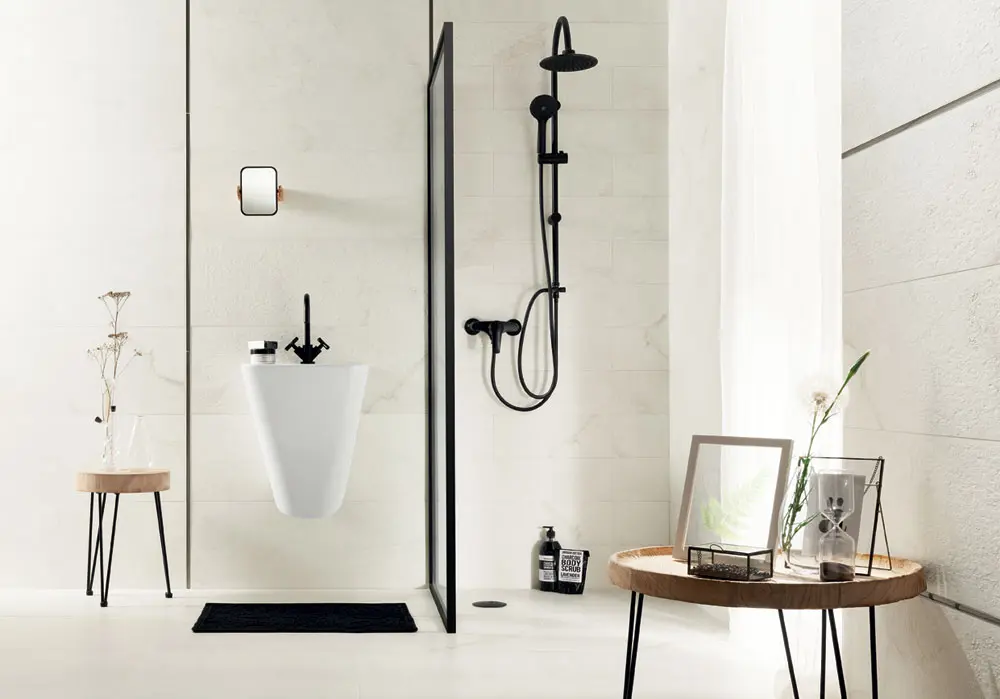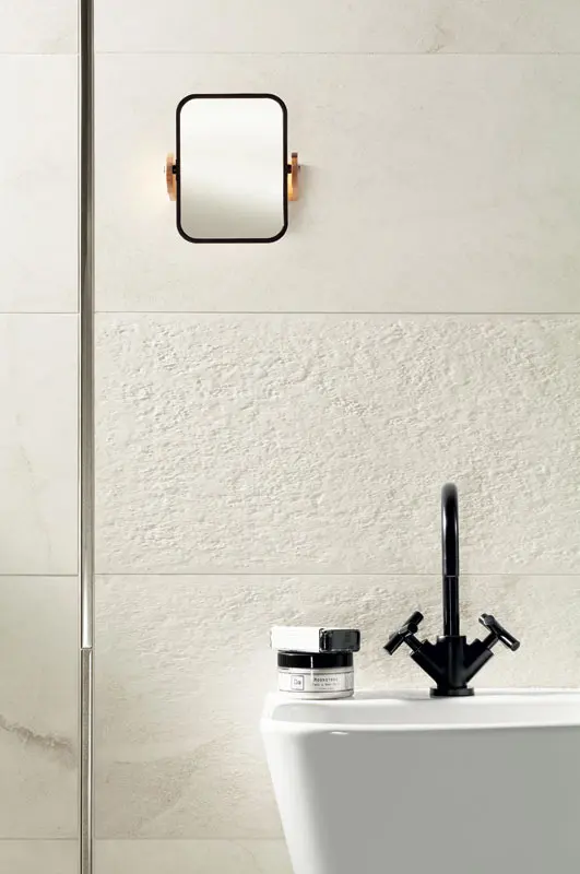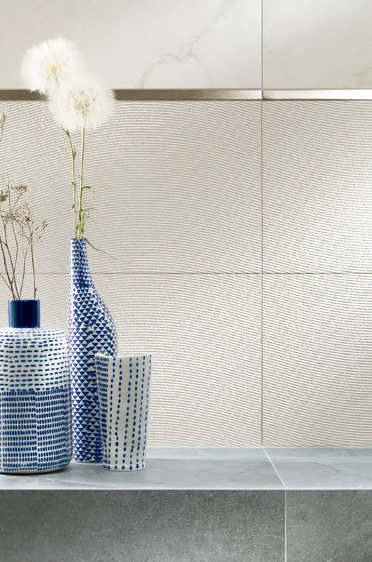 Fiecare fişă pare să îmbrace spaţiul într-o atmosferă de linişte: structura subtilă, muchiile rectificate, tonul neutru creează o scenă perfectă pentru detalii — accente metalice, lemn deschis la culoare, textile moi. Contrastul dintre alb şi gri, prezent în colecţie, permite utilizarea acestei faianţe atât pe pereţi întregi, cât şi ca element de accent.