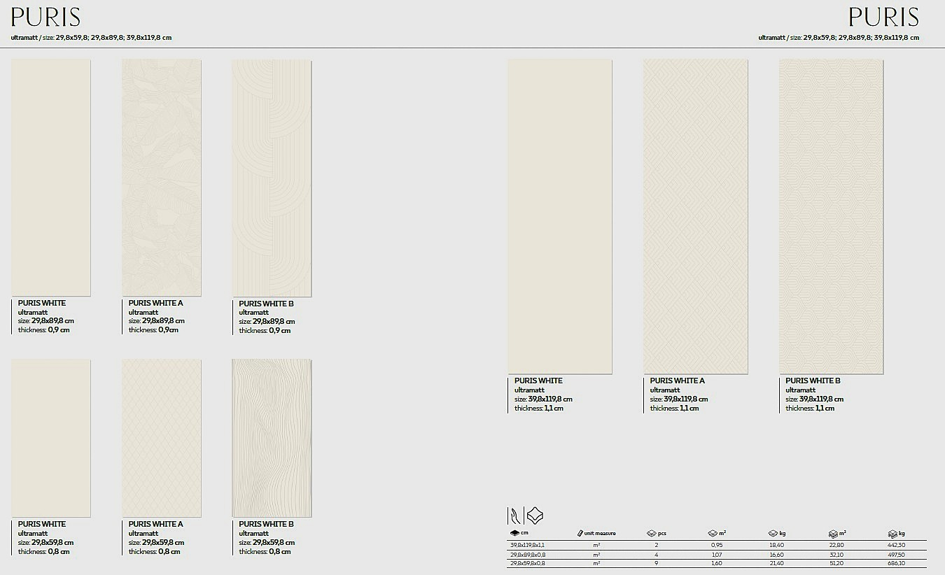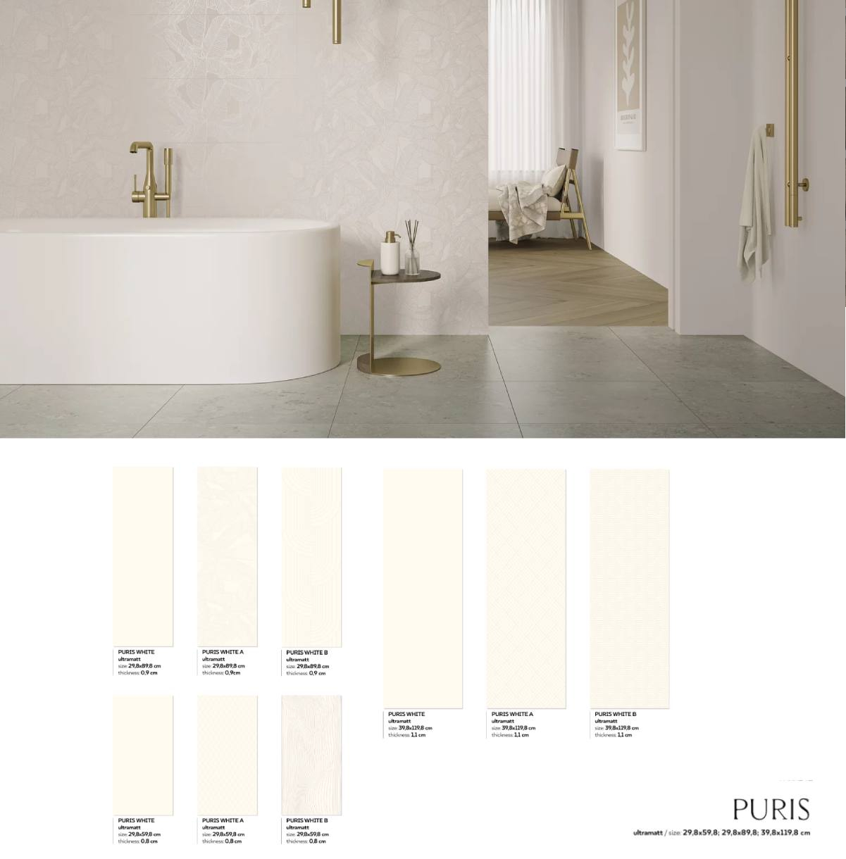 Colecția de plăci de faianță PURIS oferă libertatea de alegere între trei dimensiuni rectificate (29,8x59,8 cm, 29,8x89,8 cm și 39,8x119,8 cm). Fiecare dintre ele include o placă de bază și două plăci decorative complet compatibile, cu modele diferite.
