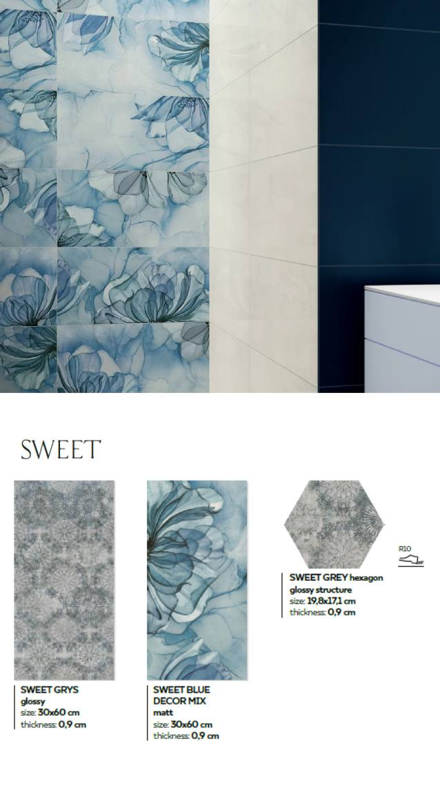 Colecția Sweet de la Paradyż aduce în interior o atmosferă luminoasă și rafinată, în care delicatețea culorilor se îmbină cu eleganța detaliilor. Nuanțele de gri și albastru pudrat creează o bază calmă, ideală pentru spații care inspiră relaxare și echilibru. Finisajul lucios accentuează lumina naturală, oferind senzația de prospețime și spațiu aerisit.