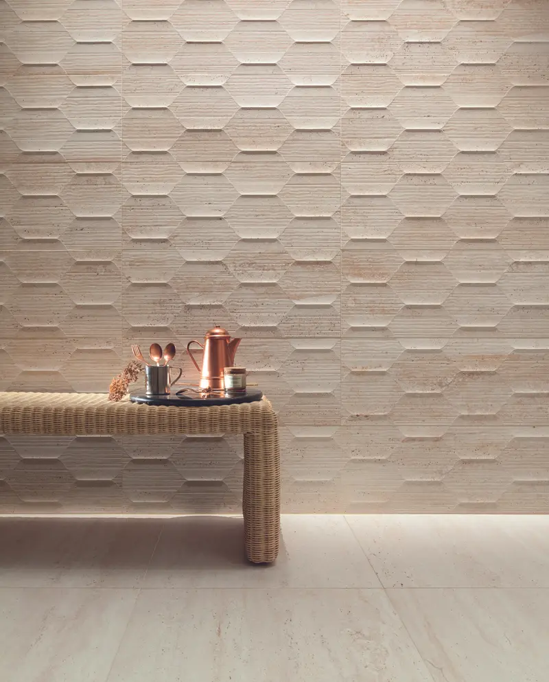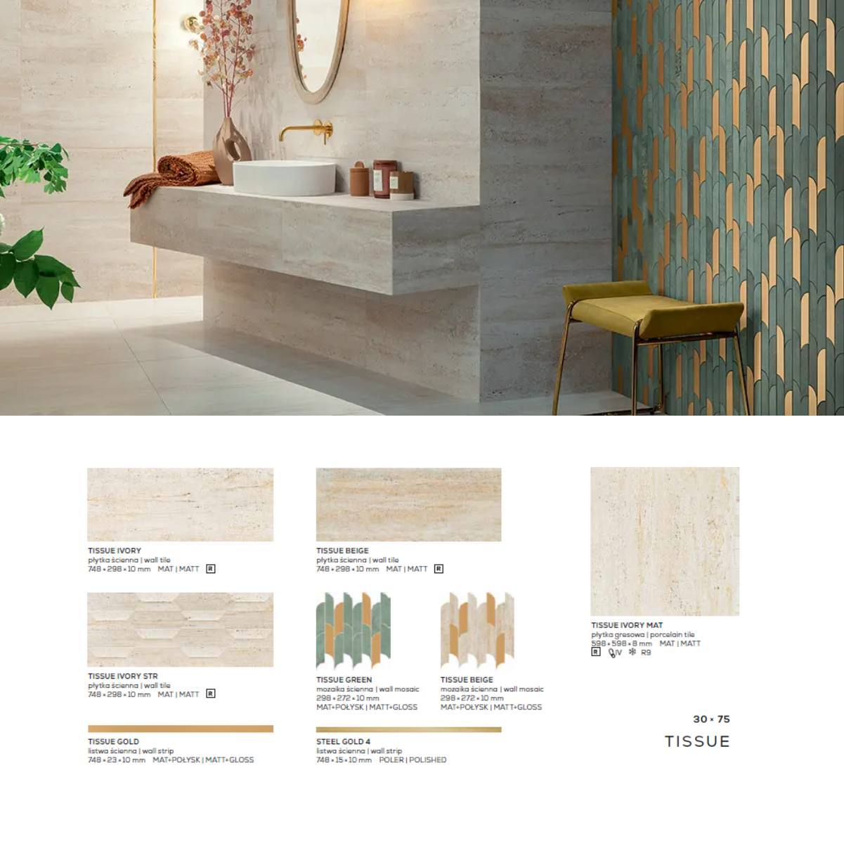 Colecţia Tissue de la Tubądzin se îmbracă într-o dantelă de nuanţe calde de bej şi ivoriu, temperate de accente de verde profund şi scintilaţii aurii. Suprafaţa mată, discretă, pare să respire ritmul anilor ’60 — o epocă a curajului estetic şi a graficii îndrăzneţe — reinterpretată pentru spaţiul interior contemporan. Fiecare placă devine o pagină în decorul tău, iar liniile şi tonurile îţi invită privirea să alunece calm, dar cu intenţie. Rezultatul: un ambient elegant şi primitor, unde textura devine poveste, iar culoarea — stare. Ideală pentru baie, bucătărie sau holuri în care vrei să trimiţi o declaraţie de stil subtil: „luxul discret se află în detalii curate”.