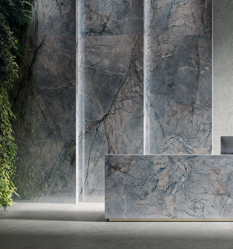 Disponibilă în formate mari 120 × 280 cm, 120 × 120 cm și 60 × 120, colecția permite realizarea de suprafețe continue, cu rosturi minime, accentuând impresia de lux și modernitate. Finisajul lucios și muchiile rectificate evidențiază frumusețea naturală a plăcilor și sporesc efectul vizual al spațiului.