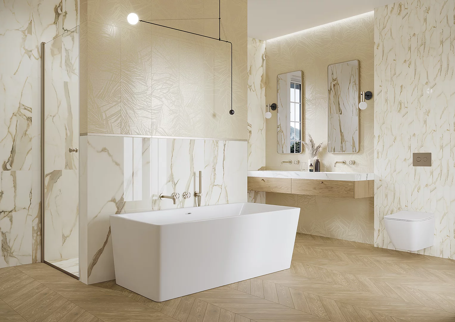 Pe lângă formatul de 29,8 x 89,8 cm, colecția a fost extinsă cu o nouă formă hexagonală și completată cu o placă de pardoseală cu un model nobil de Calacatta într-o nuanță caldă. Motivul de tapet încântător și unic, format din frunze organice încorporate într-o structură fină, țesută, cu ornamentații subtile, strălucește cu auriu pentru a ilumina discret împrejurimile. Farmecul tradițional al eleganței clasice întâlnește aici eleganța modernă, iar de acum înainte, aceste plăci vor spune această poveste în fiecare zi în împrejurimile tale.