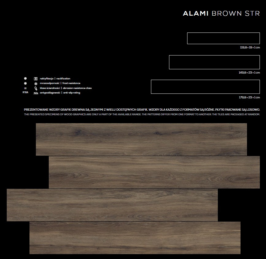 Gresia Alami Brown STR aduce căldura și profunzimea lemnului natural în tonuri bogate de maro, combinând estetica organică cu durabilitatea gresiei porțelanate. Textura „STR” redă fidel fibra lemnului, oferind detalii subtile și o senzație tactilă plăcută, pentru un ambient autentic și rafinat.