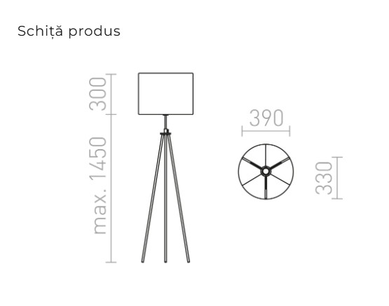 Lampă de podea pe trepied, cu design modern și funcțional, potrivită pentru interioare contemporane. Dispune de posibilitate de reglare a înălțimii, oferind flexibilitate în poziționarea luminii. Abajurul textil asigură o lumină caldă și difuză, ideală pentru living, dormitor sau spații de relaxare.