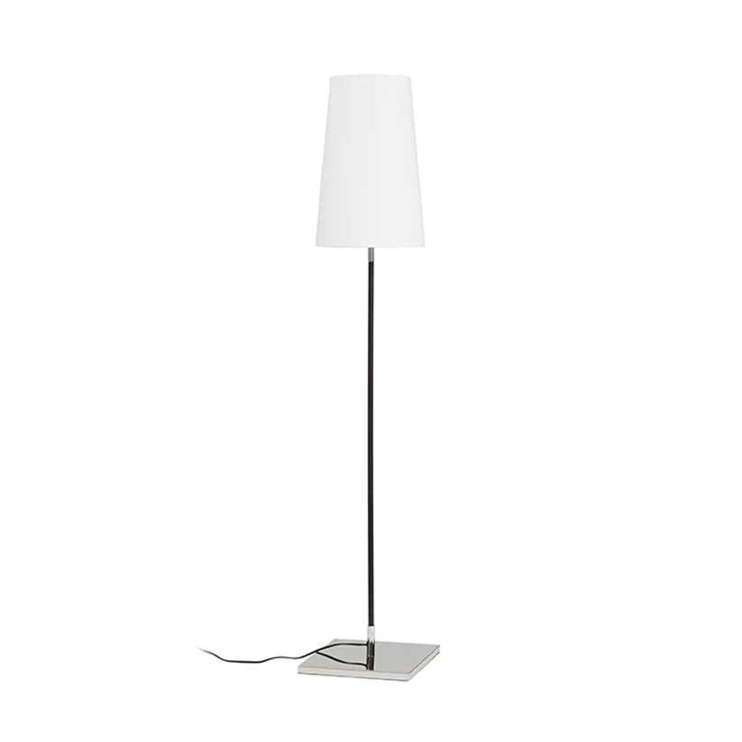 Lampă de podea cu design elegant și contemporan, având abajur conic din material textil, montat pe prindere cu filet E27. Combinația de crom și negru oferă un aspect rafinat și modern, potrivit pentru livinguri, dormitoare sau birouri cu design minimalist.