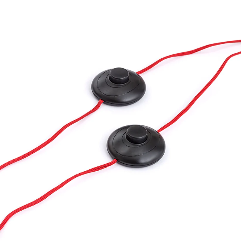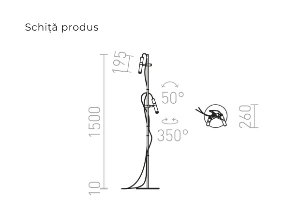 Lampă de podea cu design cromat cu două reflectoare LED glisante negre, care sunt controlate individual prin comutatoarele cablurilor de alimentare roșii. Ambele cabluri sunt terminate cu adaptoare pentru priză.