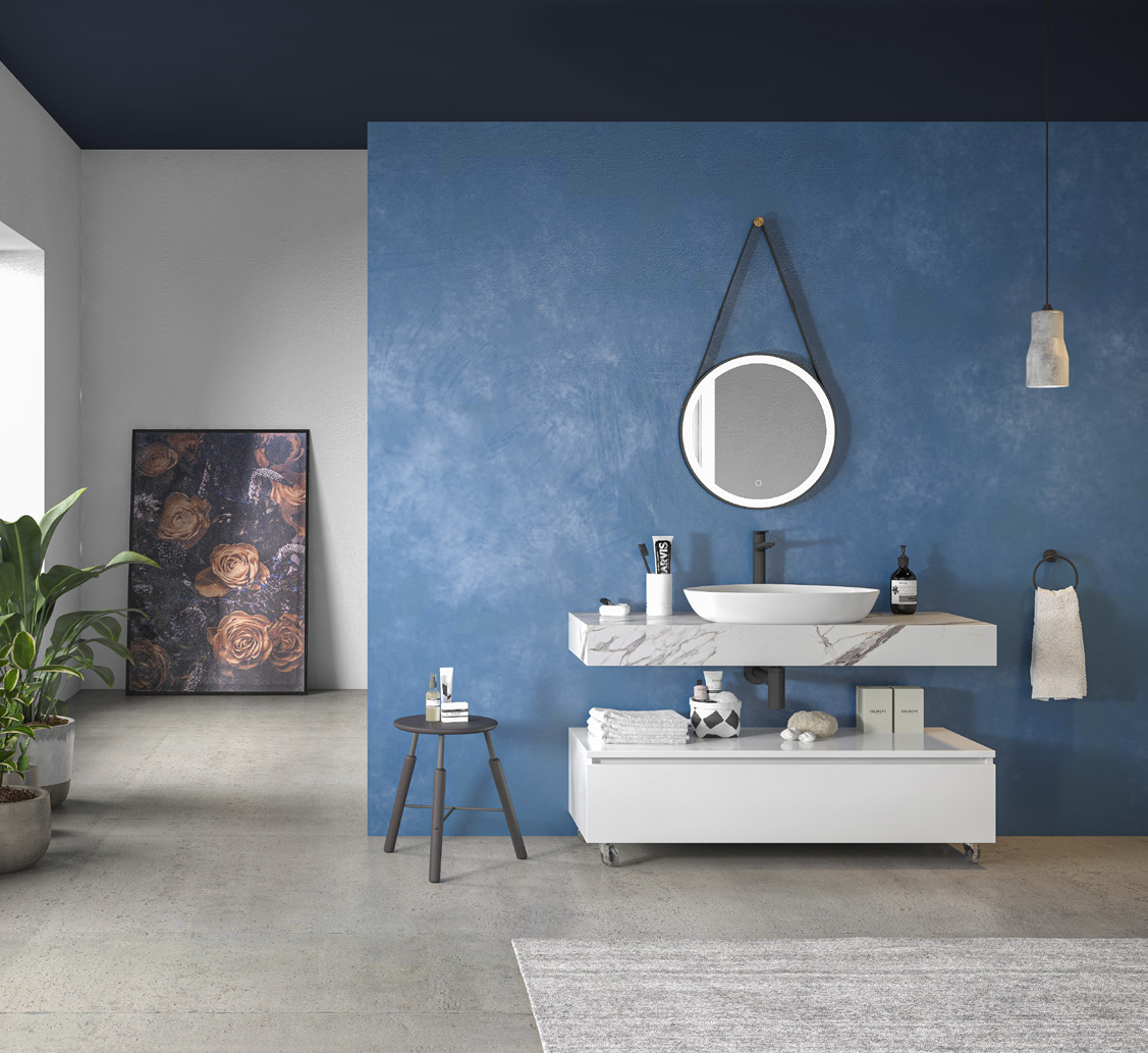 Blat cu aspect marmorat, pentru un plus de rafinament Lavoar din porțelan, rezistent și ușor de întreținut