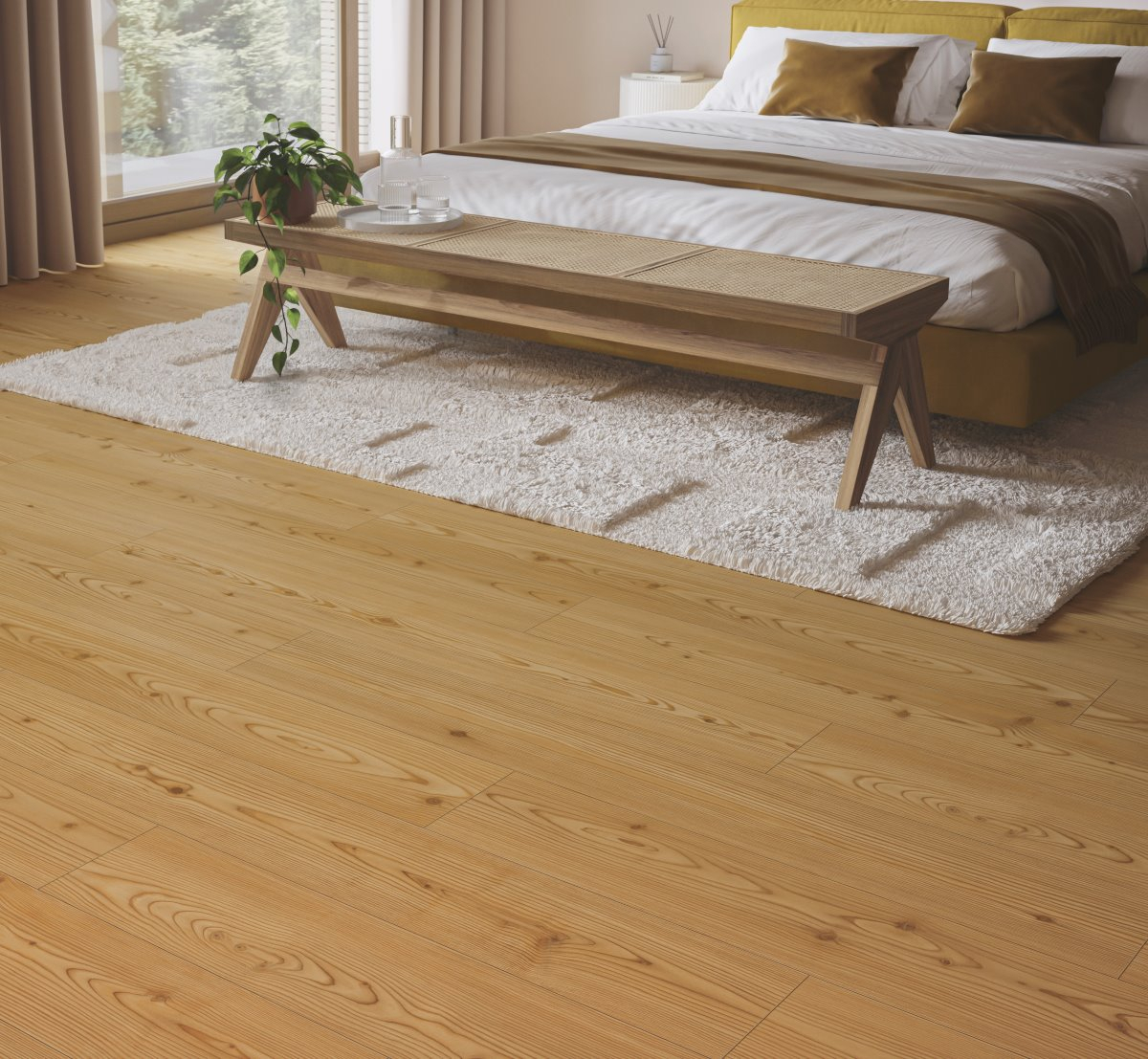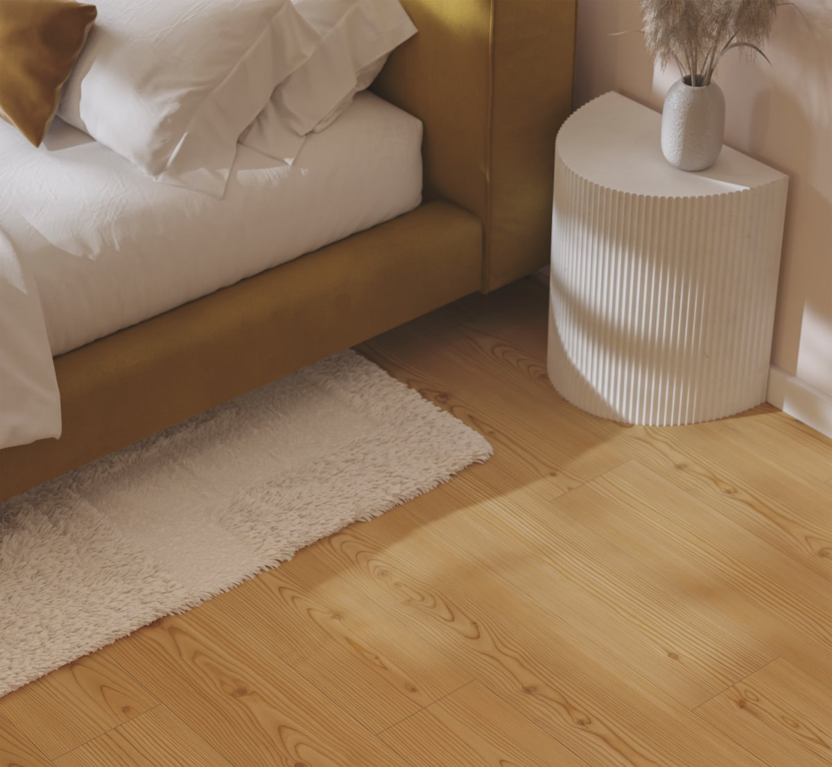 Marginile teșite pe toate laturile accentuează fidel aspectul unei pardoseli din lemn masiv, iar finisajul satinat-mat oferă un look natural și elegant. Textura calmă și armonioasă reproduce vizual lemnul netratat, conferind pardoselii un caracter autentic și plăcut.