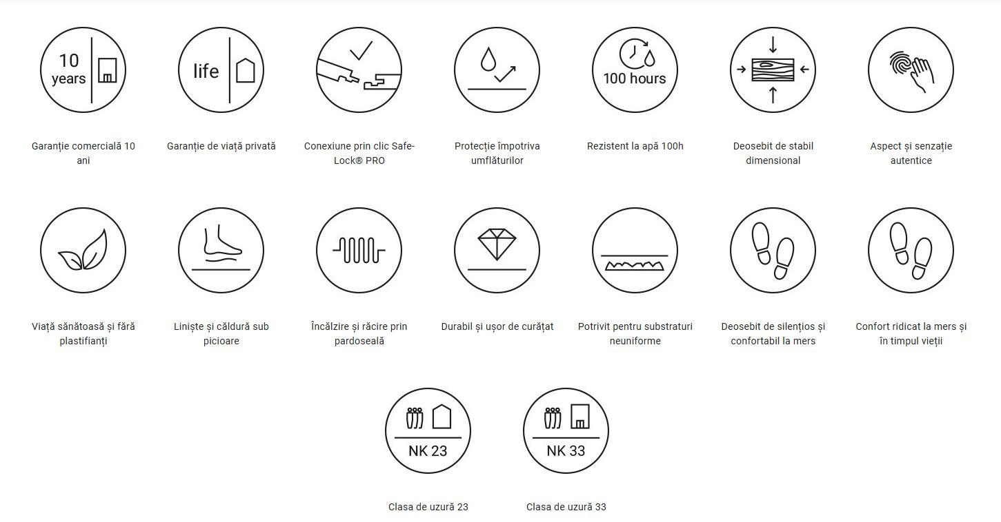 Conexiune prin clic Safe-Lock® PRO, Deosebit de stabilă dimensional, Încălzire și răcire prin pardoseală, Potrivit pentru suprafețe neuniforme, Silențios și cald sub picioare, Durabil și ușor de curățat, Confort deosebit de silențios și plăcut la mers, Aspect și senzație autentice, Confort ridicat la mers și la locuit, Viață sănătoasă și fără plastifianți, Protecție împotriva umflăturilor, Garanție comercială 10 ani, Garanție privată pe viață, Clasa de uzură 23, Clasa de uzură 33, Rezistență la apă 100h |