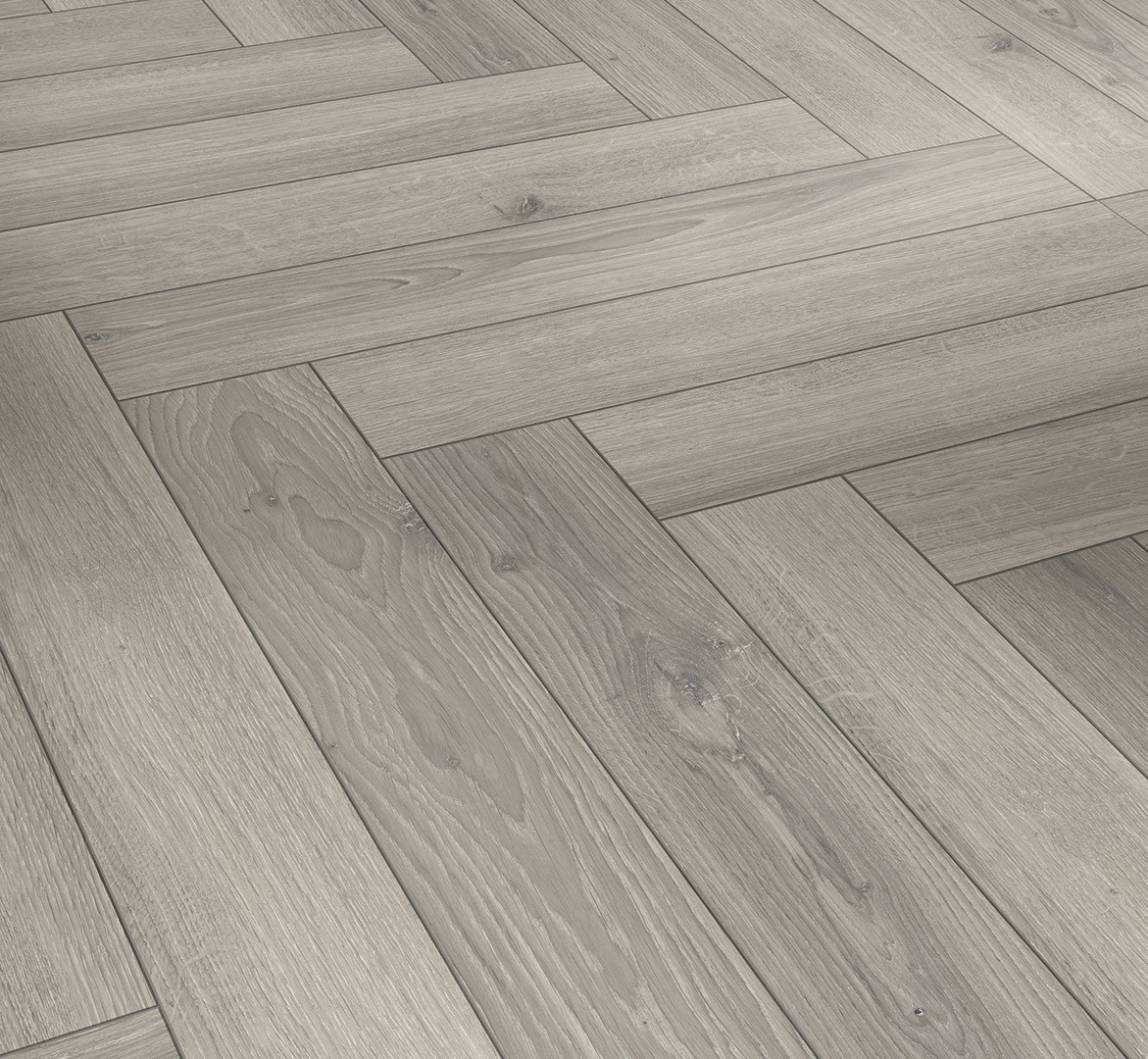 Pardoseala laminată Parador Stejar Gri Deschis din colecția Trendtime 3 impresionează prin modelul tradițional în spic de hering, perfect pentru amenajări interioare moderne și rafinate. Plăcile, cu dimensiunile 858 x 143 x 8 mm, au margini teșite, evidențiind fiecare scândură și conferind pardoselii aspectul autentic al lemnului natural.