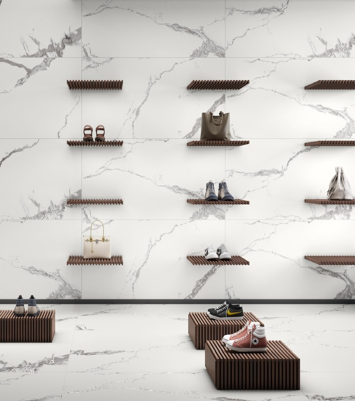 Finisajul lucios intensifică reflexia luminii, mărind optic încăperea și adăugând o notă de lux discret. Datorită marginilor rectificate, plăcile se îmbină aproape perfect, creând o suprafață continuă, uniformă și spectaculoasă.