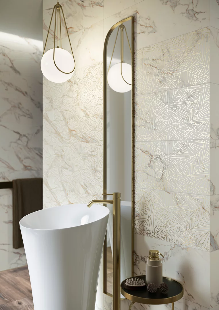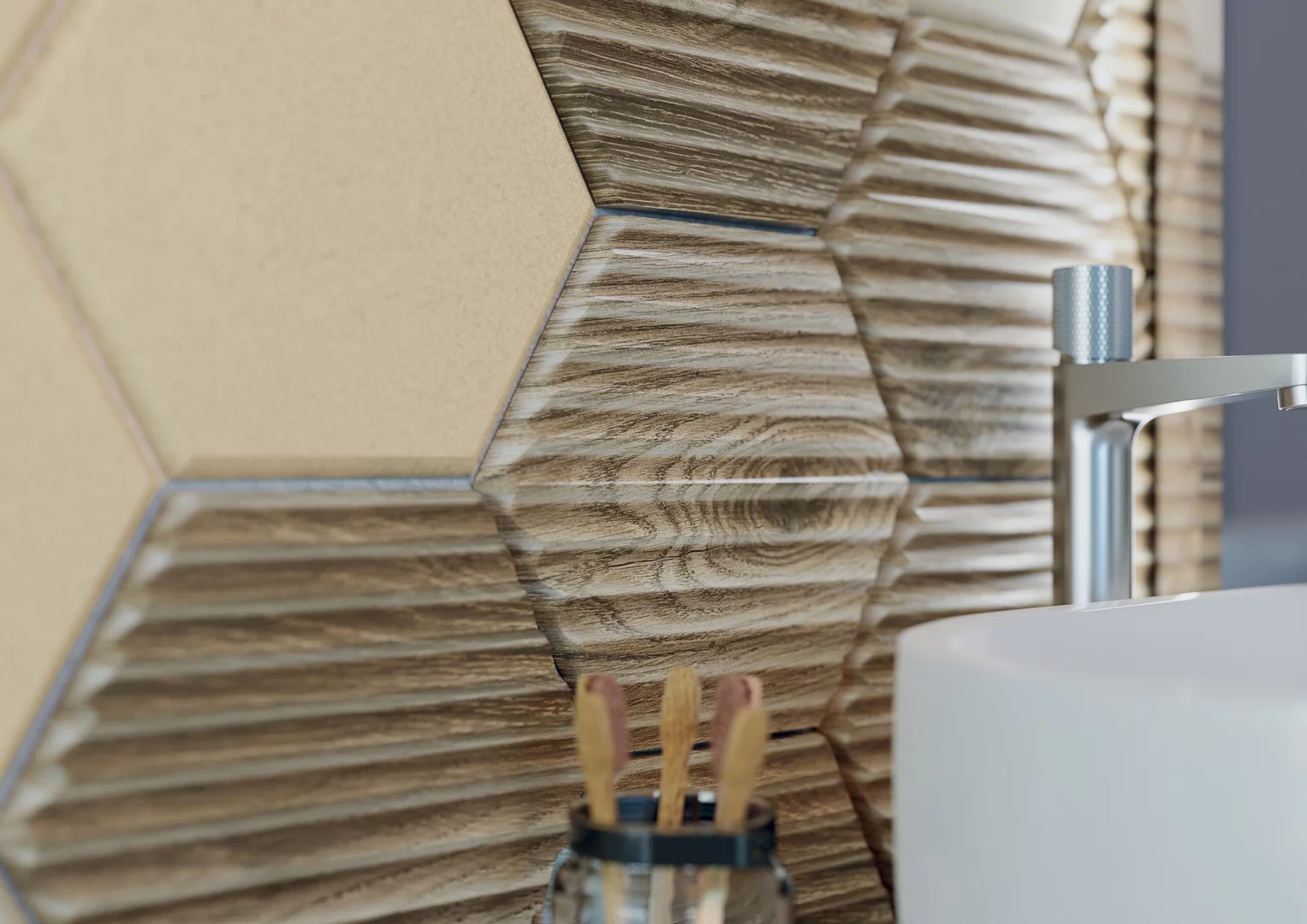 Combinația de structuri permite realizarea unor aranjamente neconvenționale care vor rămâne la modă multă vreme. Proiectul va fi completat de detalii distinctive, neobișnuite – inserții cu un model floral auriu strălucitor sau hexagoane tridimensionale în bej cald sau cu grafică de lemn.