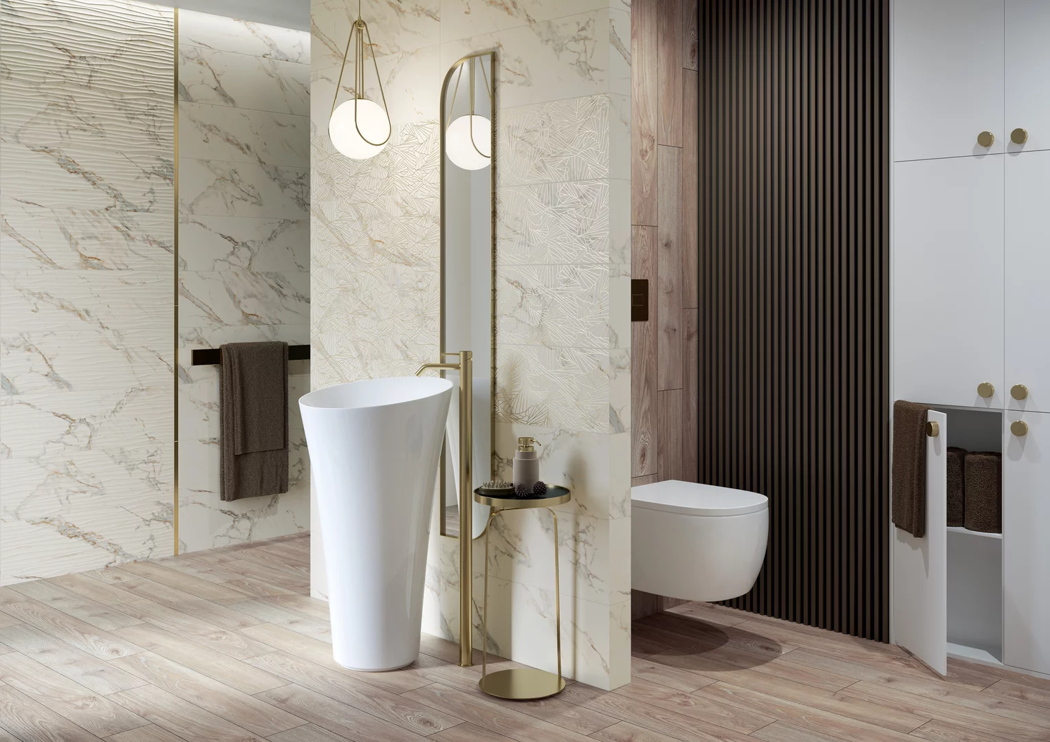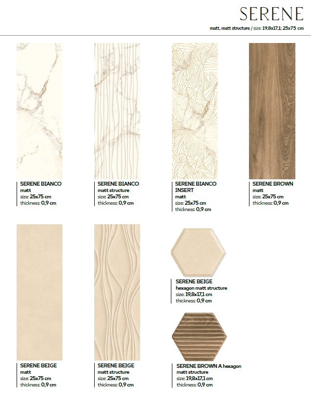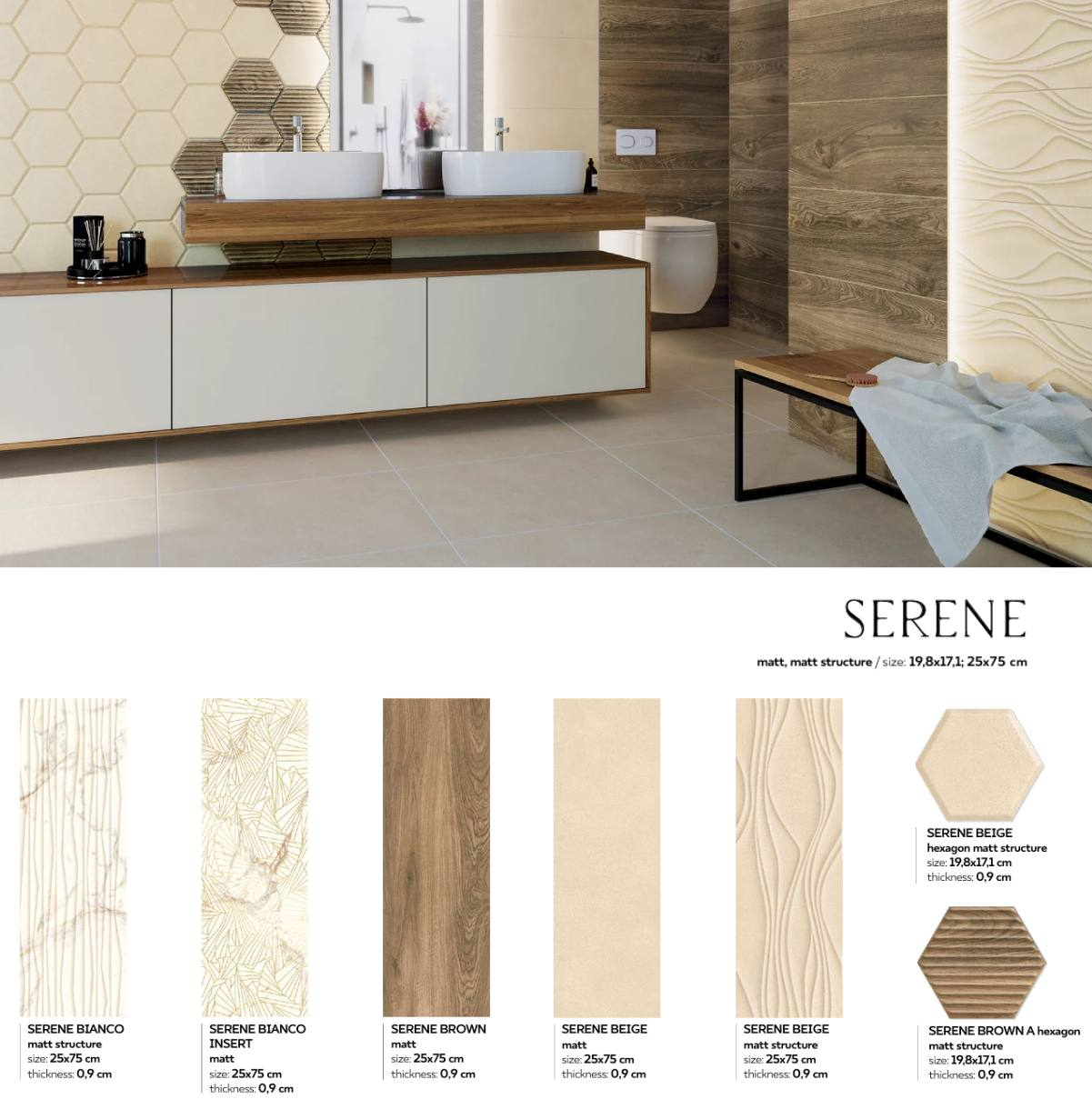 Ambientul înconjurător reprezintă emanația naturală a caracterului dumneavoastră. Indiferent dacă preferați interioarele austere și temperamentale sau cele confortabile și calde, colecția SERENE vă va ajuta să creați un spațiu care să vă reflecte gustul unic. Marmura aurie calacatta clasică și elegantă, gresia bej și lemnul în tonuri neutre se numără printre cele mai rafinate și durabile tendințe.