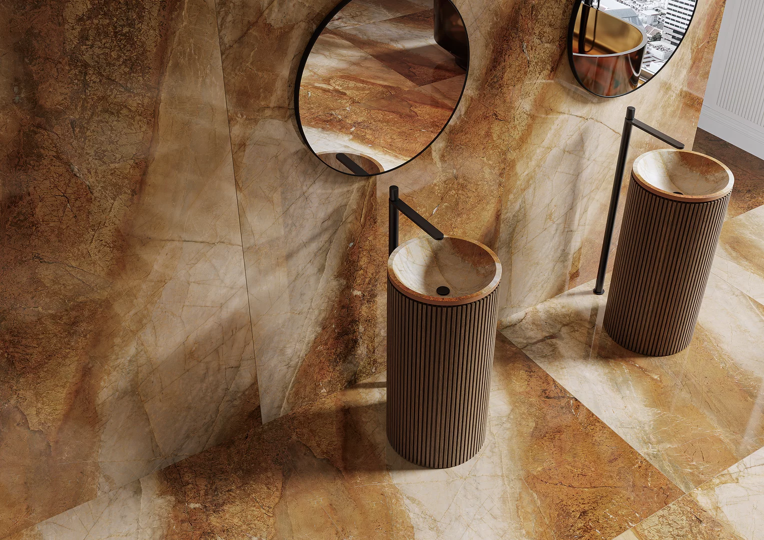 Tonuri arse, pământii sinterizate, nuanțe de ghimbir înflăcărat cu inserții perlate, până la maro intens. Efectele diverse se completează perfect în adâncimea modelului cu finisaj satinat, oferindu-i o atingere inimitabilă. Abstract Rust nu este doar un element dominant ideal pentru pereții luxoși ai livingului, ci și un companion perfect pentru betoanele subtile, calde, și pentru lemn. Poate fi folosit la finisarea băilor, bucătăriilor sau a livingului. Alege unicitatea inconfundabilă pentru interiorul tău.