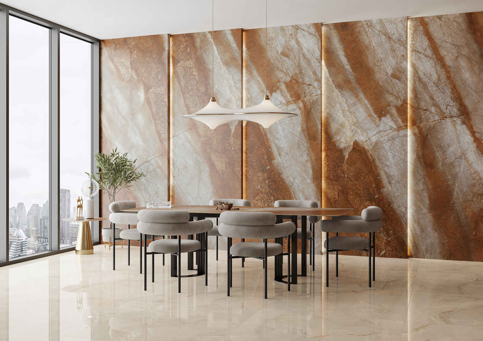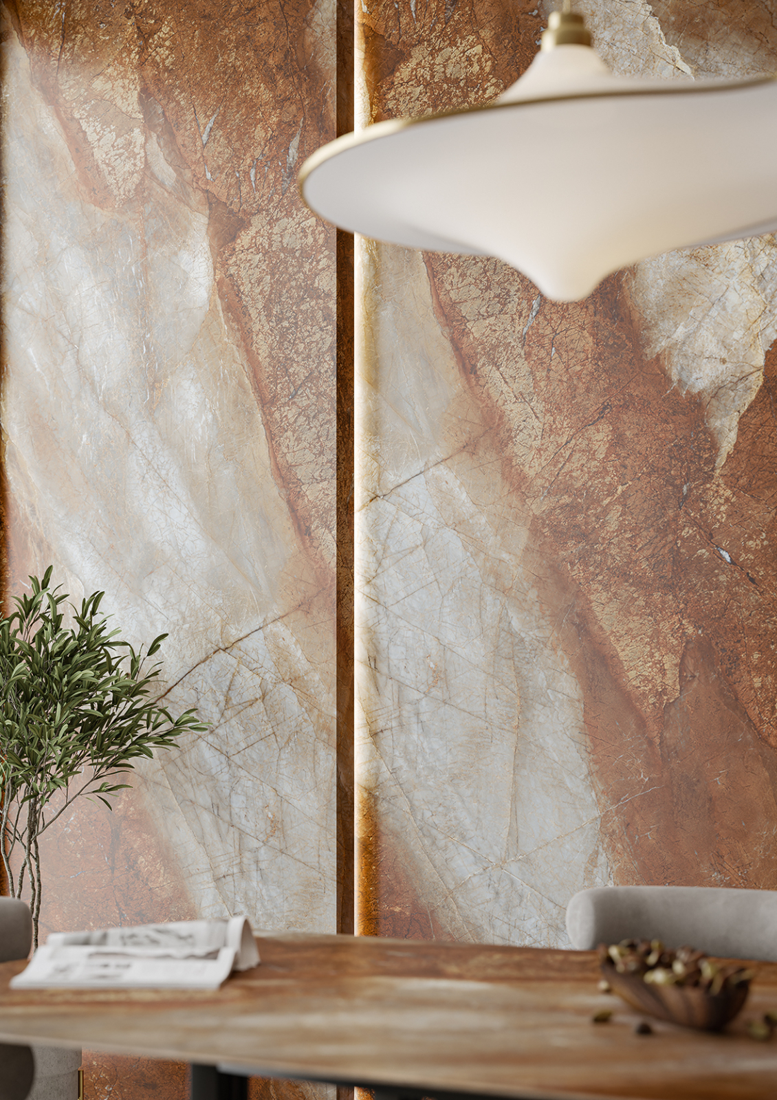 Tonuri arse, pământii sinterizate, nuanțe de ghimbir înflăcărat cu inserții perlate, până la maro intens. Efectele diverse se completează perfect în adâncimea modelului cu finisaj satinat, oferindu-i o atingere inimitabilă. Abstract Rust nu este doar un element dominant ideal pentru pereții luxoși ai livingului, ci și un companion perfect pentru betoanele subtile, calde, și pentru lemn. Poate fi folosit la finisarea băilor, bucătăriilor sau a livingului. Alege unicitatea inconfundabilă pentru interiorul tău.